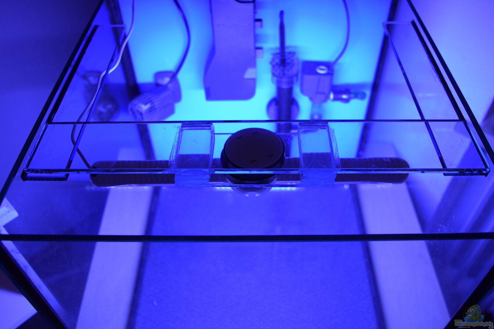 Eheim skim Marine 100 kombiniert mit einer Membranpumpe von Sera; Im laufenden Betrieb kommt hier noch ein Ozonisator von Sander (kleinste Ausführung), gekoppelt mit einer Zeitschaltuhr zum Einsatz. Der Ozonisator läuft 2 Mal am Tag für jeweils 15 Minuten. Um 22.00 Uhr und 4.00 Uhr und ist läuft mit nur 25% Leistung