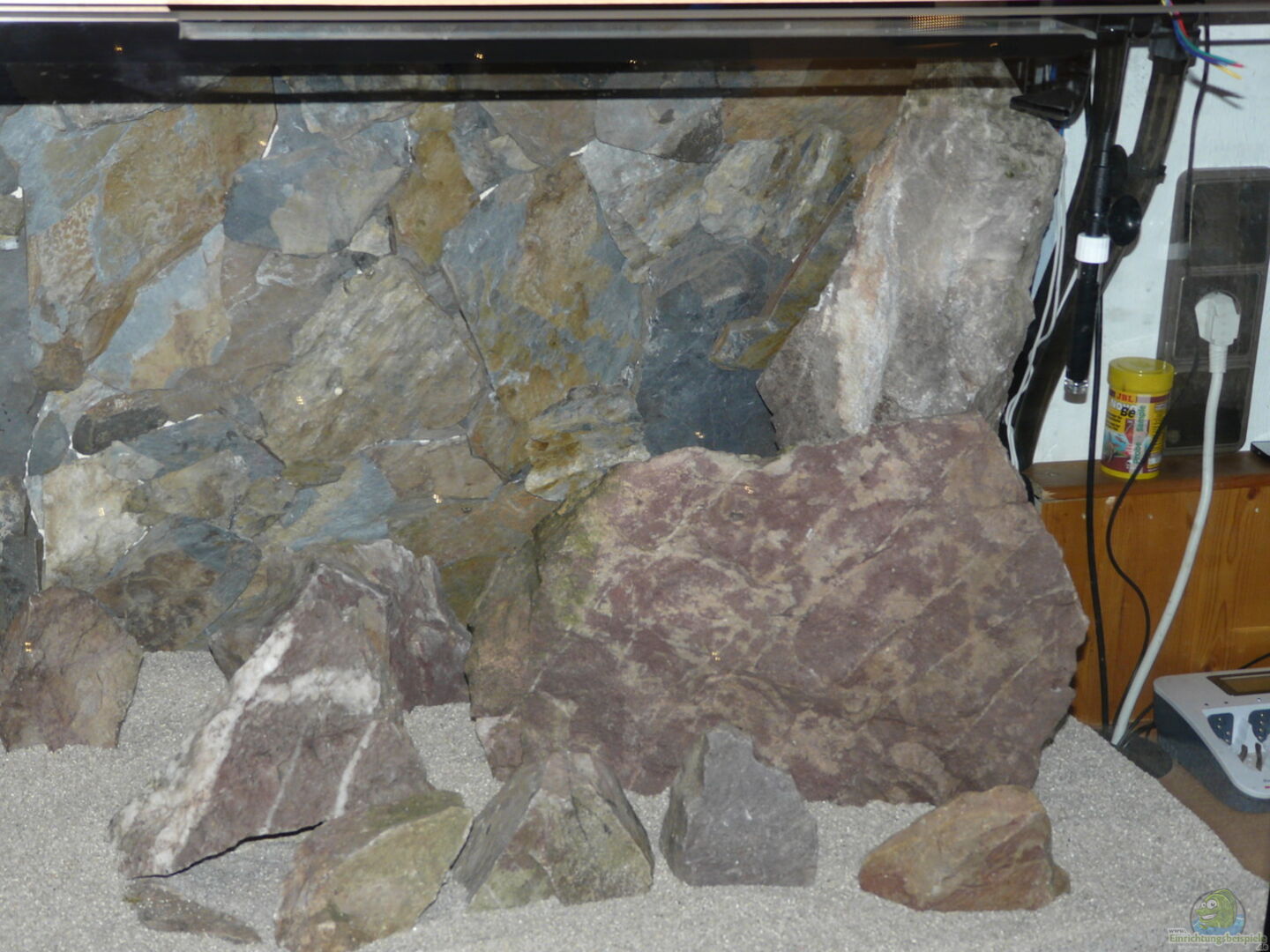 Die Wurzel über ebay bestellt. Die Steine im Wald gesucht. Die Aquarienrückwand wurde selbst gebaut. Auf eine 2 cm Styrodurplatte wurden mit Knauf Aquariensilikon Schieferplatten (selbst gesucht) aufgeklebt. Die Styrodurplatte musste in der Mitte geteilt werden, damit sie ins Aquarium eingebracht werden konnte. Danach wurde sie mit Silikon an der Rückwand angeklebt.