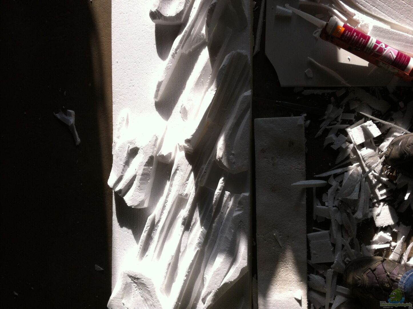 zweiteilige 3D-Rückwand (Eigenbau) bestehend aus: 40mm Styroporplattem 2kg handelsüblicher Zement Acrylfarbe schwarz, wei??, braun, blau Epoxydharz zum versiegeln mit Küchensilikon ins Becken punktuell verklebt Bilder separat hochgeladen - Bauphasenbeschreibung wird nachgereicht. Vielleicht als Ansatz für den Heimwerker: Dauer ca. 15 Stunden in der Garage und Kostenfaktor ca. 25??? (anstatt 270??? für eine Standardrückwand ;-)