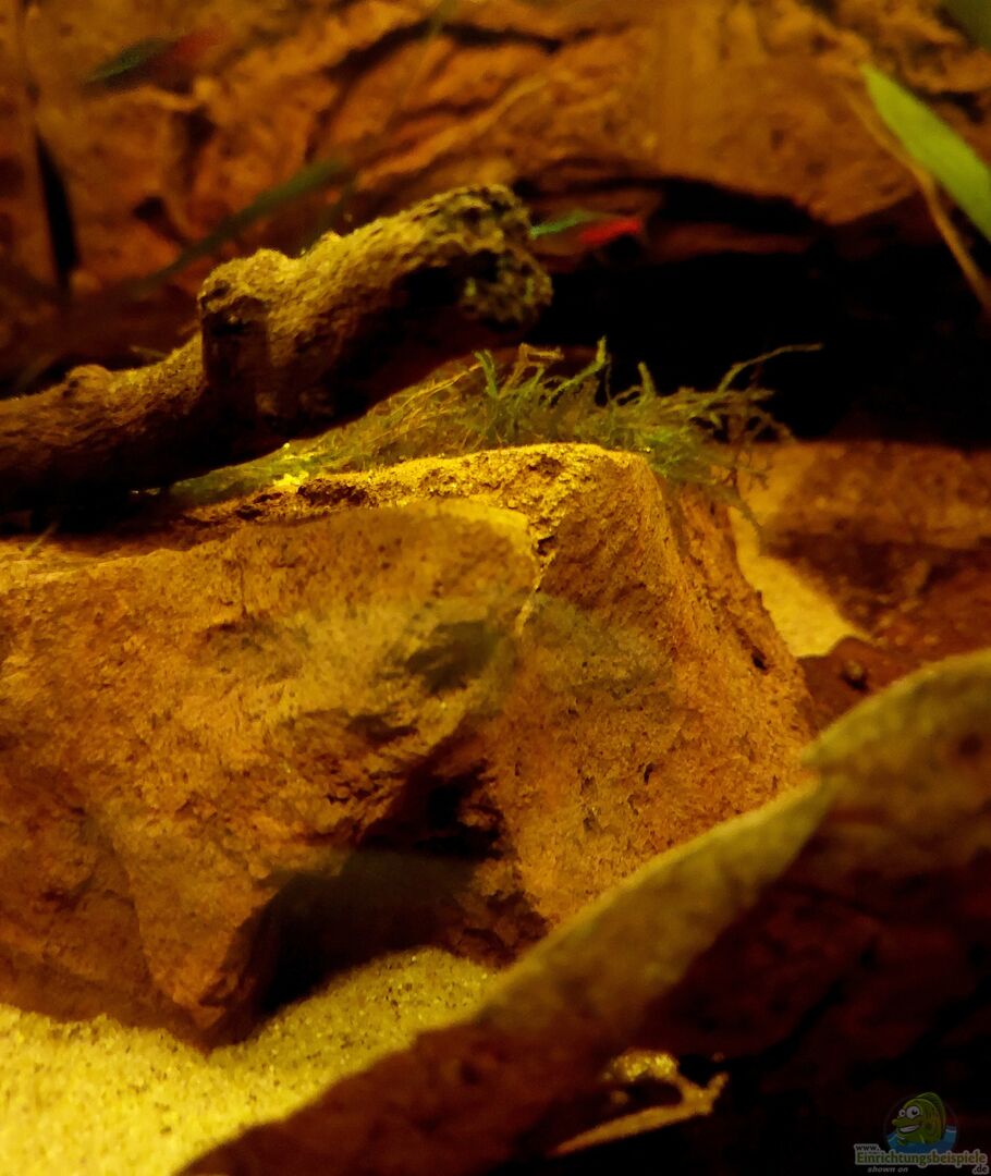 15x Moorkienwurzeln: Damit erfolgte die Nachbildung eines ins Wasser gefallenen großen Astes (rechte Seite). Sowie die Nachbildung eines kleinen Baumstamms (linke Seite) 1x großer Stein Seemandelbaumblätter: Schwankende Anzahl in unterschiedlichen Größen. Verleihen dem Aquarium ein natürliches Aussehen. 2x Rückwand JUWEL Cliff dark