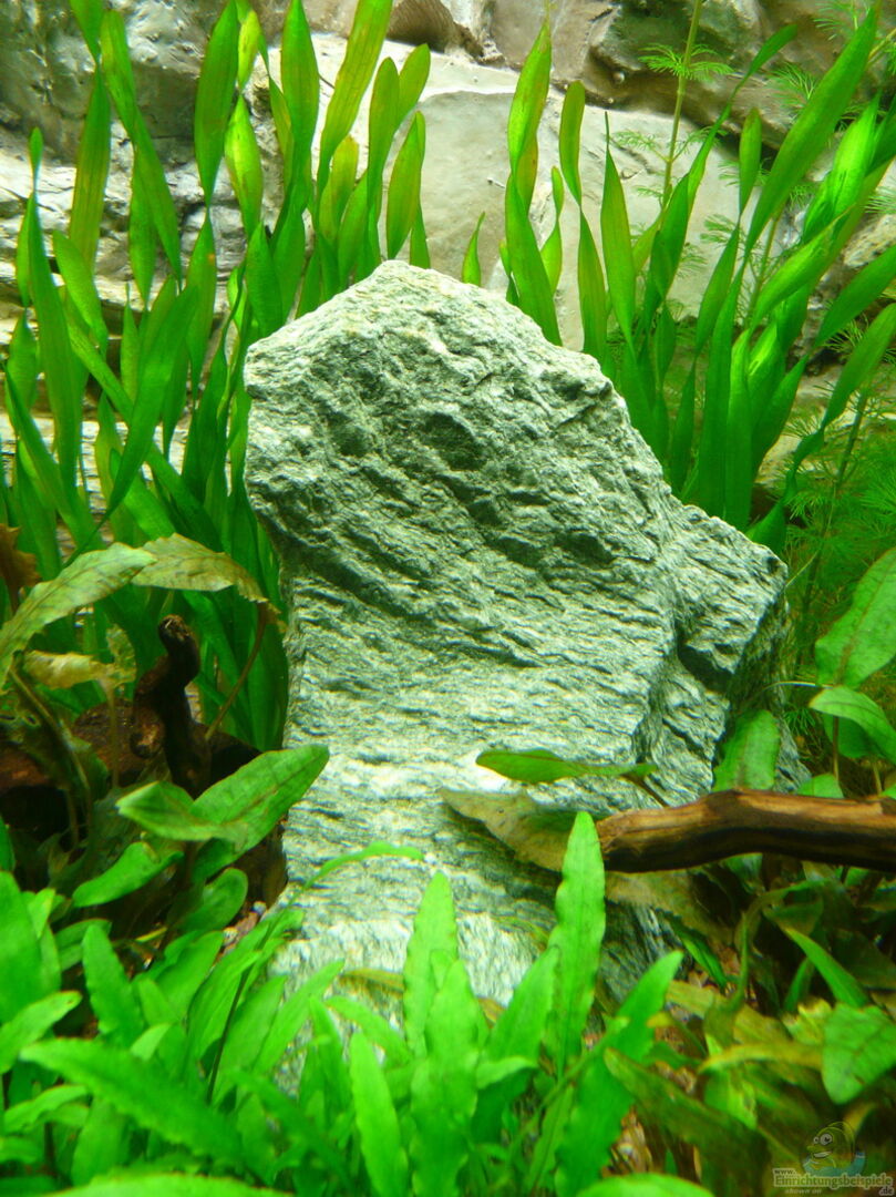 mehrere gro??e Bruchsteine aus grünem Granit vom Steinmetz, insgesamt gut 25kg für 6, 80 Euro 2 rote Mohrwurzeln vom Kölle Zoo 1 Kunsthöhle von EKOL (die ist richtig schön nartürlich gestaltet und Qualitativ einwandfrei) in Steinform für meinen Gelbsaumwels. Die Steine und Wurzeln bieten zudem noch sehr viele Versteckmöglichkeiten für Garnelen und Schlafplätze für die Schmerlen. Im Hintergrundgrün finden die Salmler schöne Schlafplätze.