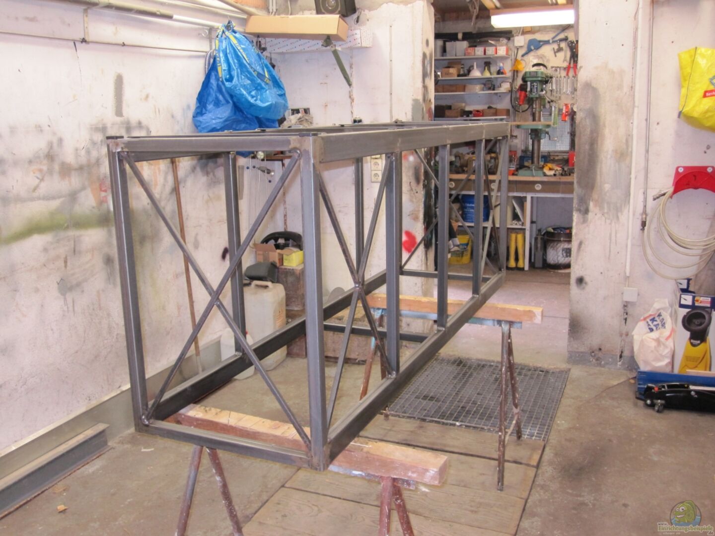 Eingeklebter Dreikammer-Innenfilter Drei Bohrungen im Boden ( 2xAnsaugung/1xAusströmen) ??ber einer Ansaugung wird das Wasser gewechselt (raus und rein) Selbstgebauter Schrank mit Beleuchtung, Wasseranschlu?? u. Abflu?? eingeklebte 3d Rückwand