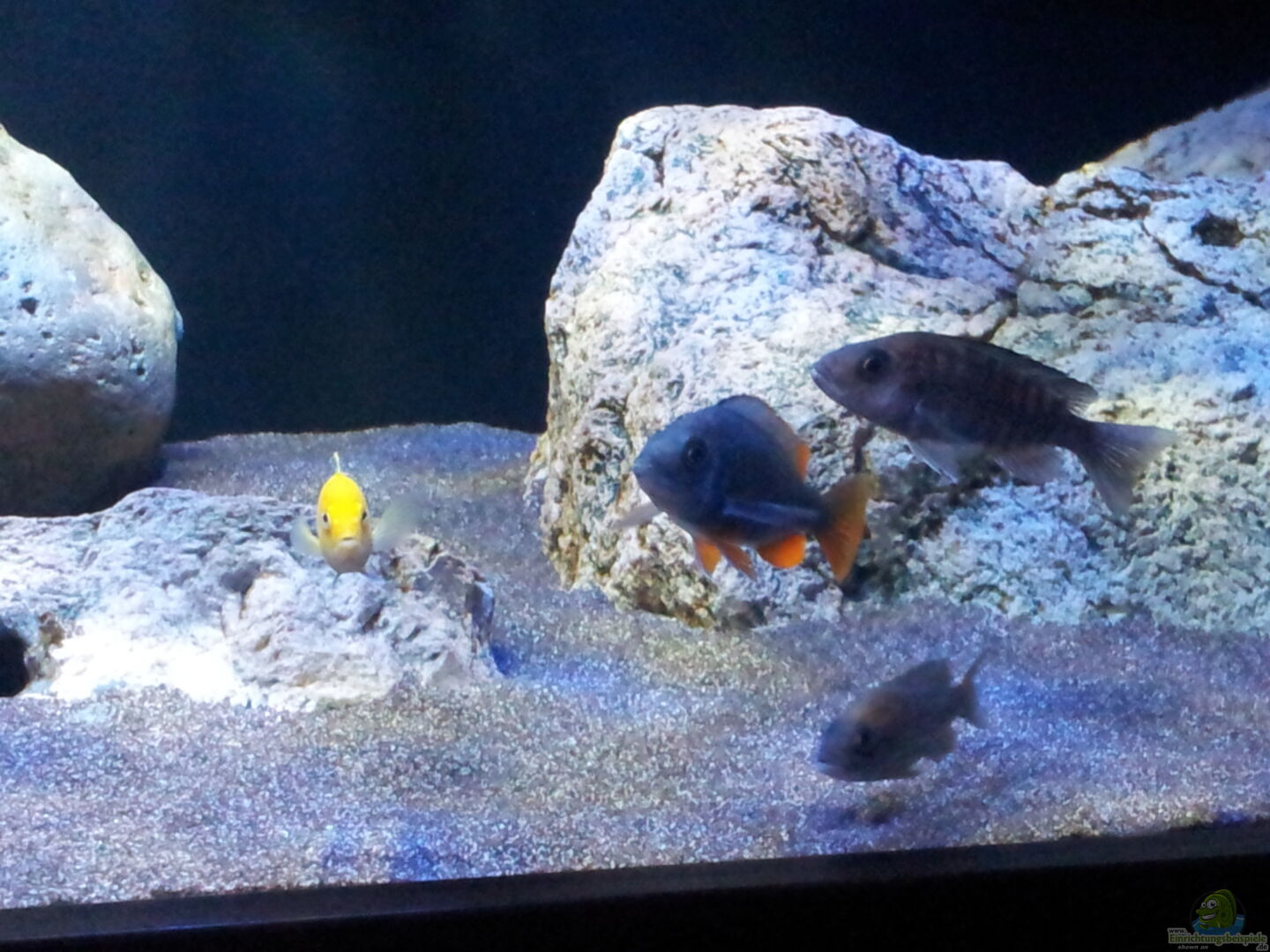 Aulonocara stuartgranti ngara 1/1 Aulonocara stuartganti usisya 2/2 Aulinocara stuartgranti maleri 1/2 Aulonocara jacobfreibergi mamelela undu reef 1/2 Copadichromis borley Kadango 1/3 Sciaenochromis fryeri 1/3 Labidochromis caeruleus 3/6 (ca. 5-7 cm gro??) Ich bin mir der Gefahr einer möglichen Hybridisierung der Aulonocaras durchaus bewusst. Da ich mich nur an der Schönheit der Tiere erfreuen möchte, werden aus meinem Becken keine Nachzuchten abgegeben.