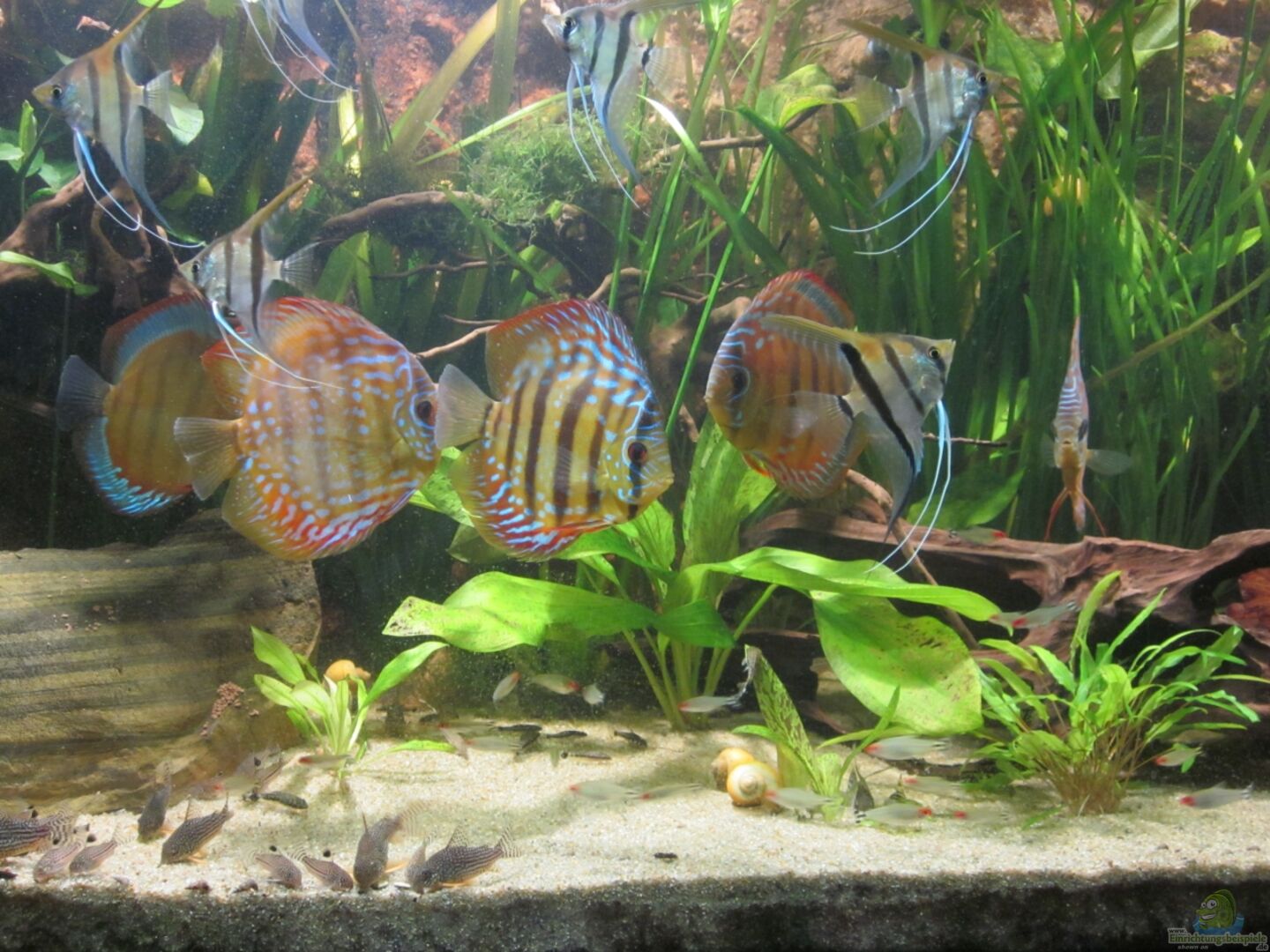 Oben-Mitte 8x Manacapura Rotrückenskalar Vom Skalar, einem der beliebtesten und weit verbreiteten Fische in Aquarien gibt es eine ganze Reihe von Zuchtformen und Varietäten. Daneben existieren aber auch in der Natur aufgrund seiner weiten Verbreitung verschiedenen Formen, über deren taxonomischen Status bisher noch nicht allzuviel bekannt ist wie beispielsweise die Manacapuro-Rotrückenskalare oder die Skalarformen aus Guyana oder dem mittleren Rio Negro. Es erscheint daher derzeit angebracht, [...]
