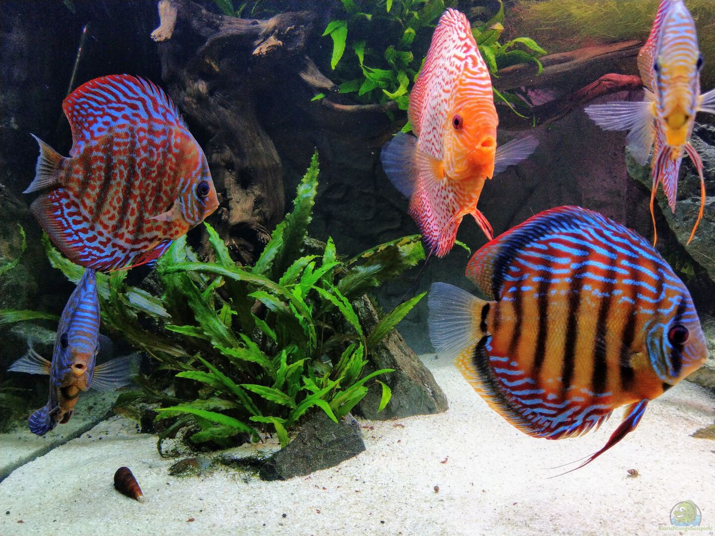 Fische: 10 Ohrengitterharnischwelse, 9 Neons 10 Corydoras Duplicareus 2 Mikrogeophagus Ramirezi Icy Blue (1M/1W) 13 Diskus Wirbellose: 5 Amanogarnelen