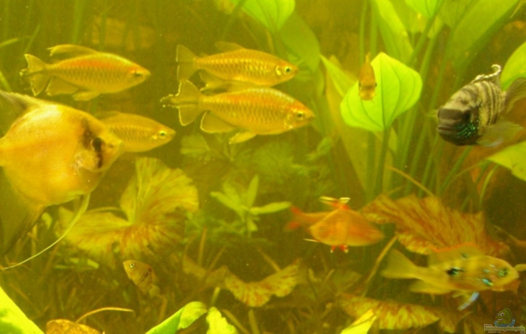5 x Schmucksalmler (Restbestand, wird nicht mehr aufgestockt) 10 x Blauer Kongosalmerler (Phenacogrammus interruptus)3/7 5 x Skalar(Pterophyllum scalare) 2 x Sajica Buntbarsch (Archocentrus sajica)1/1 2 x Blaupunkt Buntbarsch (Aequidens Coeruleus punctatus)1/1 4 x Eliotti Buntbarsch (Thorichthys ellioti)2/2 1 x Schmetterlingsbuntbasch Weibchen )Microgeophagus ramirezi)(Bock ist gestorben) 1 x Metae Buntbarsch (Aequidens Metae) 3 x Siamesische Rüsselbarbe(Crossocheilus siamensis) 10 [...]