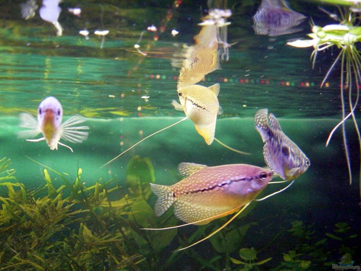 4 Mosaik Fadenfische (1m/3w) (Trichogaster leeri) (bin mir leider nicht zu 100% sicher dass es sich wirklich um einen bock und 3 weibchen handelt, aber sie kommen gut miteinander aus. 4 Blaue Fadenfische (1m/3w) (Trichogaster trichopterus) 3 Siamesische Algenfresser (Crossocheilus siamensis) 3 Blaue Antennenwelse (Ancistrus dolichopterus) 10 Rote Neons 5 Amanogarnelen