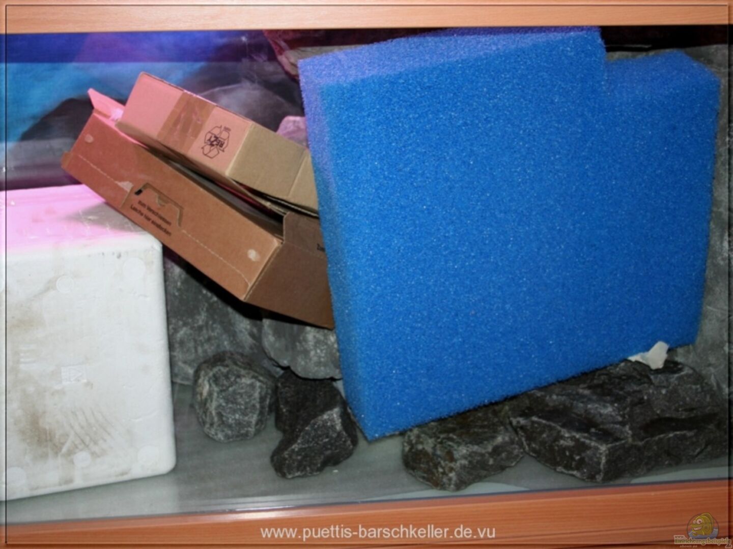 selbstgebastelte Kunstfelsen mit integriertem Felsüberhang in Verbindung mit Granit-Basalt-Steinen aus dem heimischen Steinbruch; Hintergrund selbstgemalt - Unterwasser-Landschaft im Tanganjikasee. Die Bilder zeigen den Bau der künstlichen Felsen. In den Felsüberhang (10kg) wurde eine Glasplatte integriert, die mit dem Mittelsteg des Aquariums verklebt wurde. Ich habe versucht das Becken naturnah, ähnlich dem Auslaufen einer Gerölllawine nachzubauen.