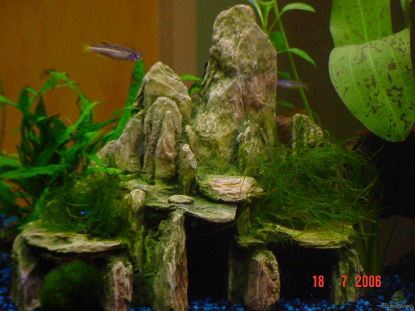 1 Steinhäuschen aus Kunstharz (inzwischen fast vollständig mit Javamoos zugewachsen) 1 Steinterasse aus Kunstharz um Sand und Kies zu trennen 1 Leuchtquarz 1 Picturestone 1 Versteinertes Holz Erlenzapfen Mangrovenholzstücke Muscheln und Bambusröhrchen in der Sandzone Schwimmringe um die Schwimmpflanzen an bestimmten Positionen halten zu können Blau-grünes Rohseidenpapier als Hintergrund