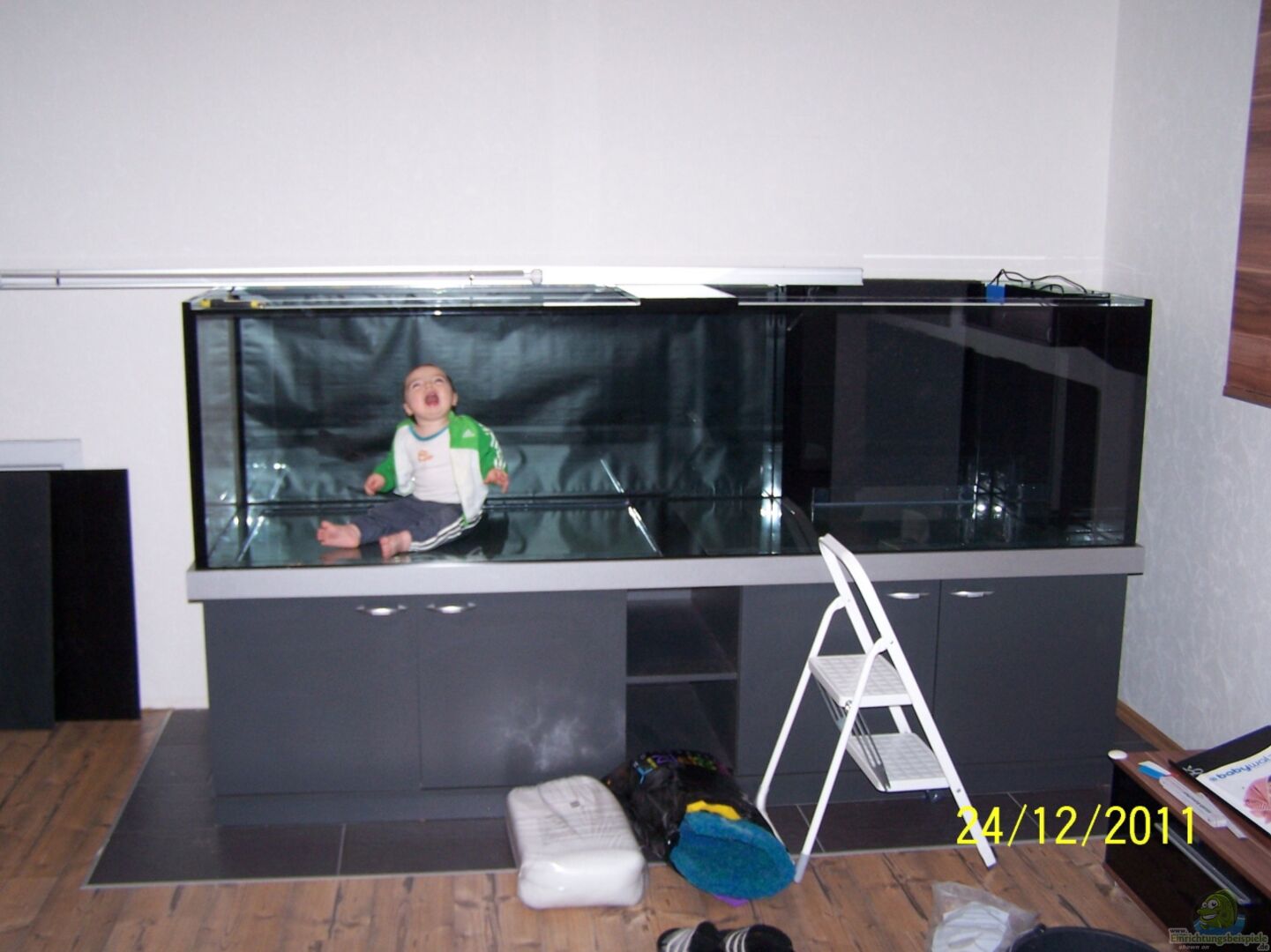 Mein Aquarienbauer Becken ins eine Sonderanfertigung auf meinen Wunsch von der Firma Aquarienbau Geschwill in Hassloch und Wurde mir am Morgen vom 24.12. geliefert. Das Becken ist aus 15mm dickem Glas geklebt. Die Front und linke seite Scheibe ist aus Wei??glas, die zwei anderen aus normalem Glas. Die beiden Filter sind aus Schwarzglas. Bodenplatte geteilt und mit 15cm breitem streifen überklebt. Die Ecken sind mit zusätzlichen glasstreifen verstärkt. Rückwand beklebt mit Matt Schwarzer [...]