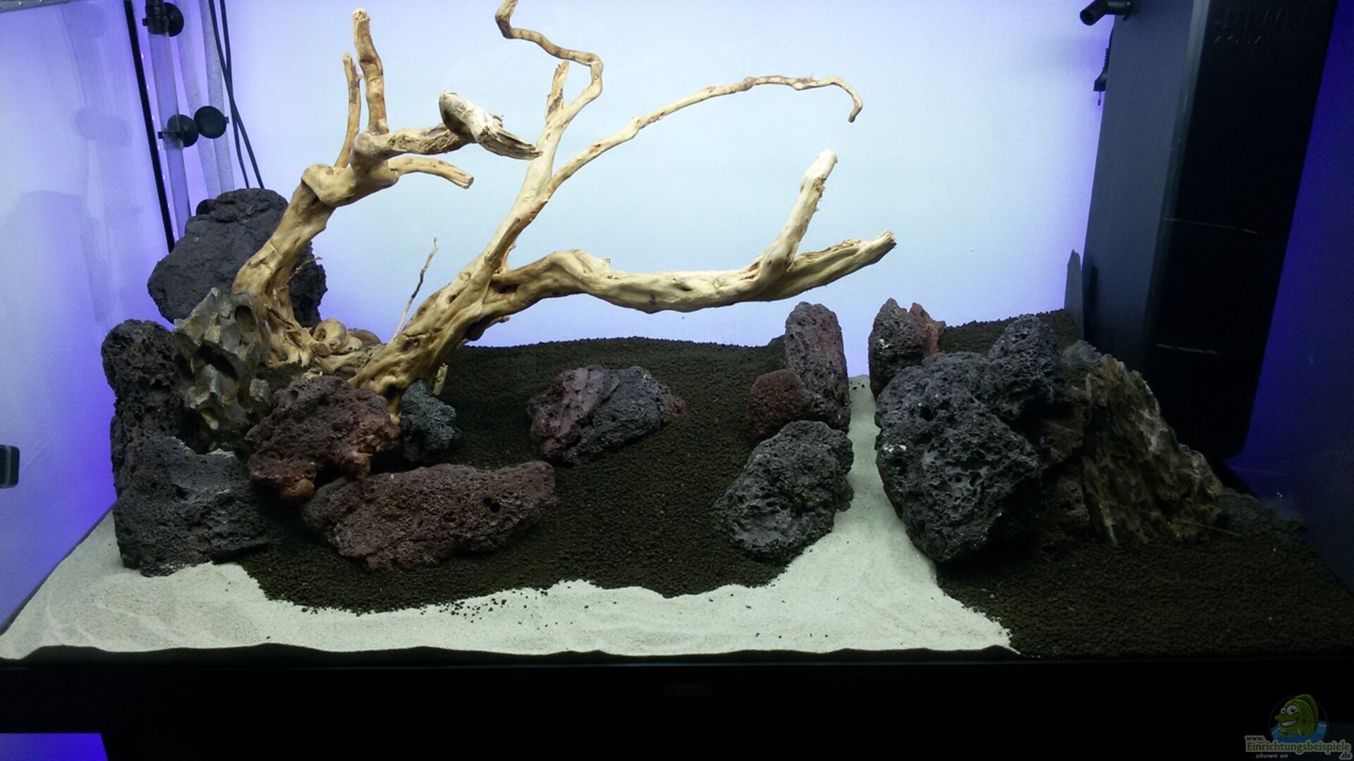 Das Hardscape wurde primär aus Islandlava/Drachenstein und Moorwood gestaltet. Die Lava wurde auf der linken Seite so angeordnet, dass diverse Versteckmöglichkeiten entstanden sind. Auf der rechten Hälfte des Beckens wurde eine kleine Schlucht aus der Lava gestaltet und darüber eine Wurzel platziert, damit auch hier ein Unterstand für meine Bewohner vorhanden ist. Durch den Einsatz von Sand, Schieferplatten und diversen Kleinkram, ist unter dem Innenfilter eine weitere Bruthöhle entstanden. [...]