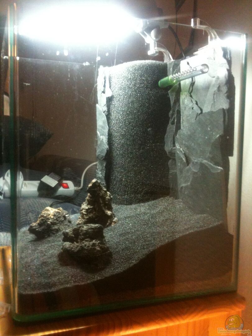 1x mangroven Wurzel im Hintergrund 3x Lavasteine in der Mitte des Beckens Naturschieverplatten an der hinteren Scheibe als Rückwand