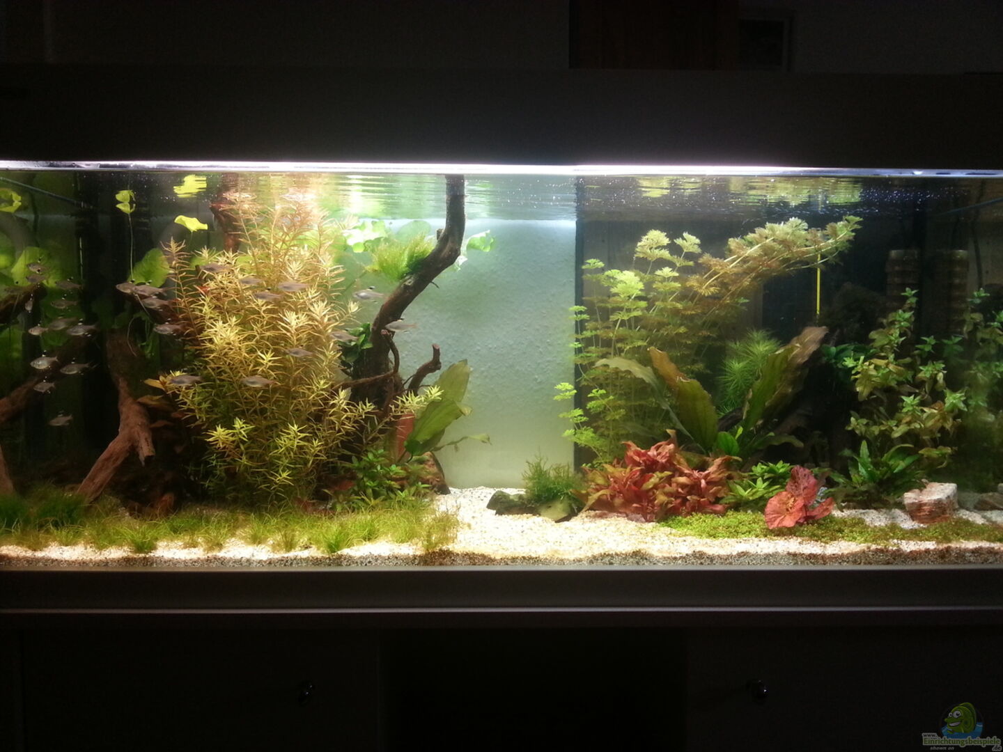 Das Aquarium hat eine Zweilochbohrung für den Au??enfilter in der Ecke links hinten des Aquariums. Dadurch müssen die Schläuche nicht au??en um das Aquarium herum gelegt werden. Au??erdem verfügt das Aquarium über verschiebbare Leuchtstoffröhren. Die Leuchtstoffröhren sind an einer Halterung befestigt, die an einer Schiene läuft. Das erleichtert die Arbeit am Aqua ungemein und so kann man flexibel Lampen tauschen oder aufstocken.