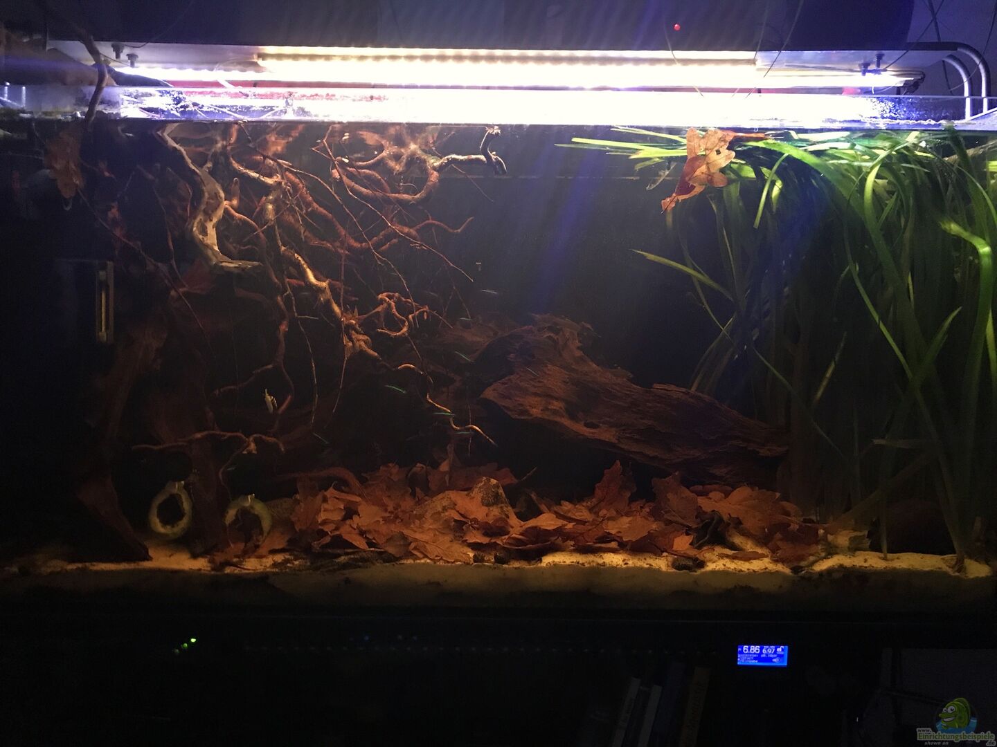 Sonderanfertigung von 110x50x50. Rechteckaquarium Der Unterschrank wurde selbst gebaut und in schwarz lackiert. Rückwand und Seitenscheiben wurden mit schwarzem Bastelkarton beklebt.