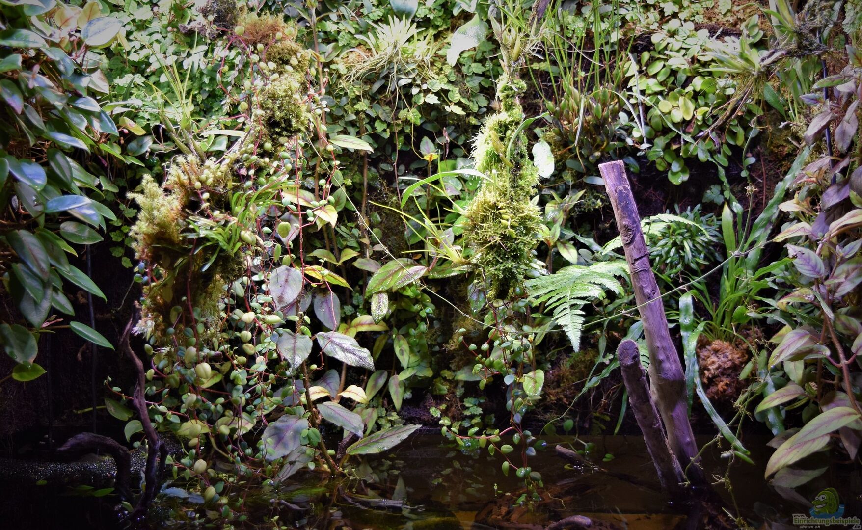 Sonderanfertigung von Aquarien und Terrarienbau Jebramek in Nürnberg. Der Wasserstand beträgt 35 cm. Ein mit Kabelbindern zusammen gebundenes Aluminium-Gestell befindet sich in der Abdeckung und fungiert als Decke, um darin Wurzeln anzubinden, die ebenso mit Kabelbindern zusammengehalten werden. Weiterhin hängen von der Decke künstlich erstellte Lianen. Sie wurden aus Paketschnur, Aquariensilion und einer Mischung aus gehäckselten Xaxim- und Weisstorf-Resten erstellt. Um das Ganze noch natürlicher [...]