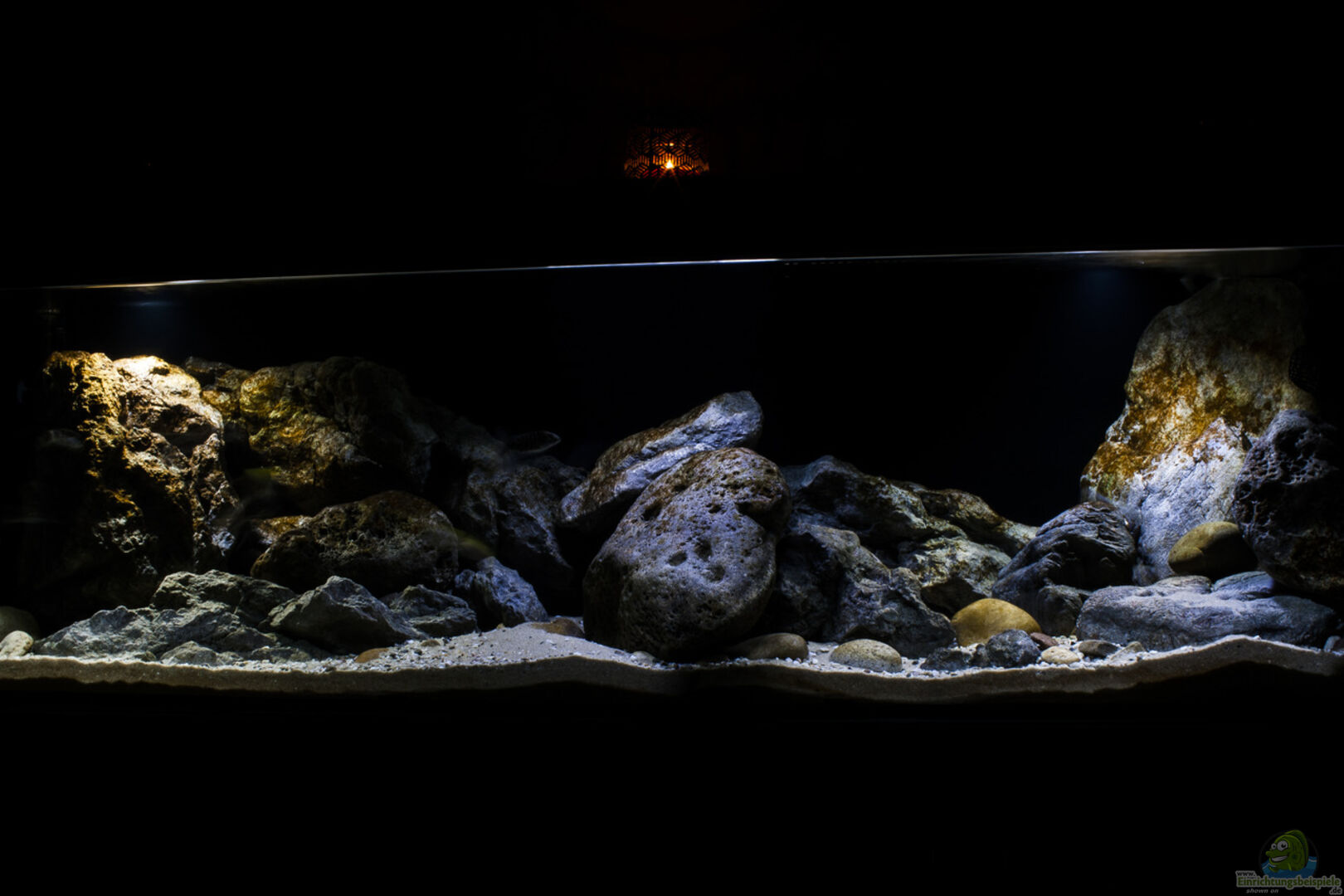 Ich habe mich dazu entschieden das Becken vor Ort von der Firma Aquariumbau Ennigerloh kleben zu lassen. Bilder vom Bau sind unten zu sehen. Die Seitenscheiben, sowie die hintere Scheibe wurden mit schwarzer D-C-Fix Folie beklebt, um im Becken eine entsprechende Tiefe zu erzeugen und damit die Schattenzonen noch mehr zur Geltung kommen. Als Unterschrank dient ein Stahlgestellt, welches komplett mit Holz verkleidet ist (4 Türen) und ebenfalls mit d-c-fix Folie foliert wurde (Buche & [...]