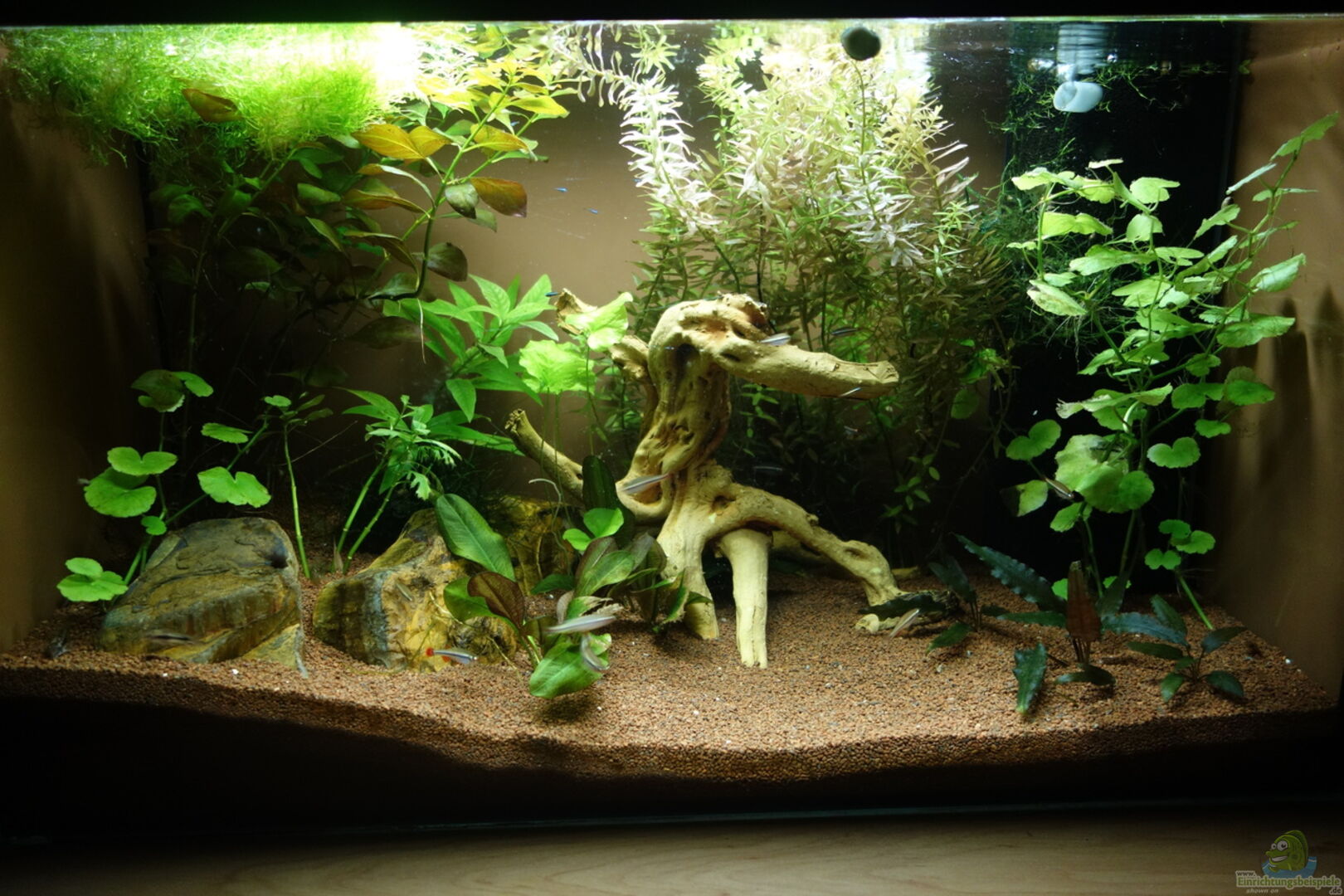 Dieses Becken besitze ich seit 2002 in verschiedenen Einrichtungen. Es wurde zuletzt im Frühjahr 2017 mit neuem Bodengrund eingerichtet. Die Rückseite sowie die Seitenscheiben sind von au??en mit brauner Acrylfarbe angestrichen.