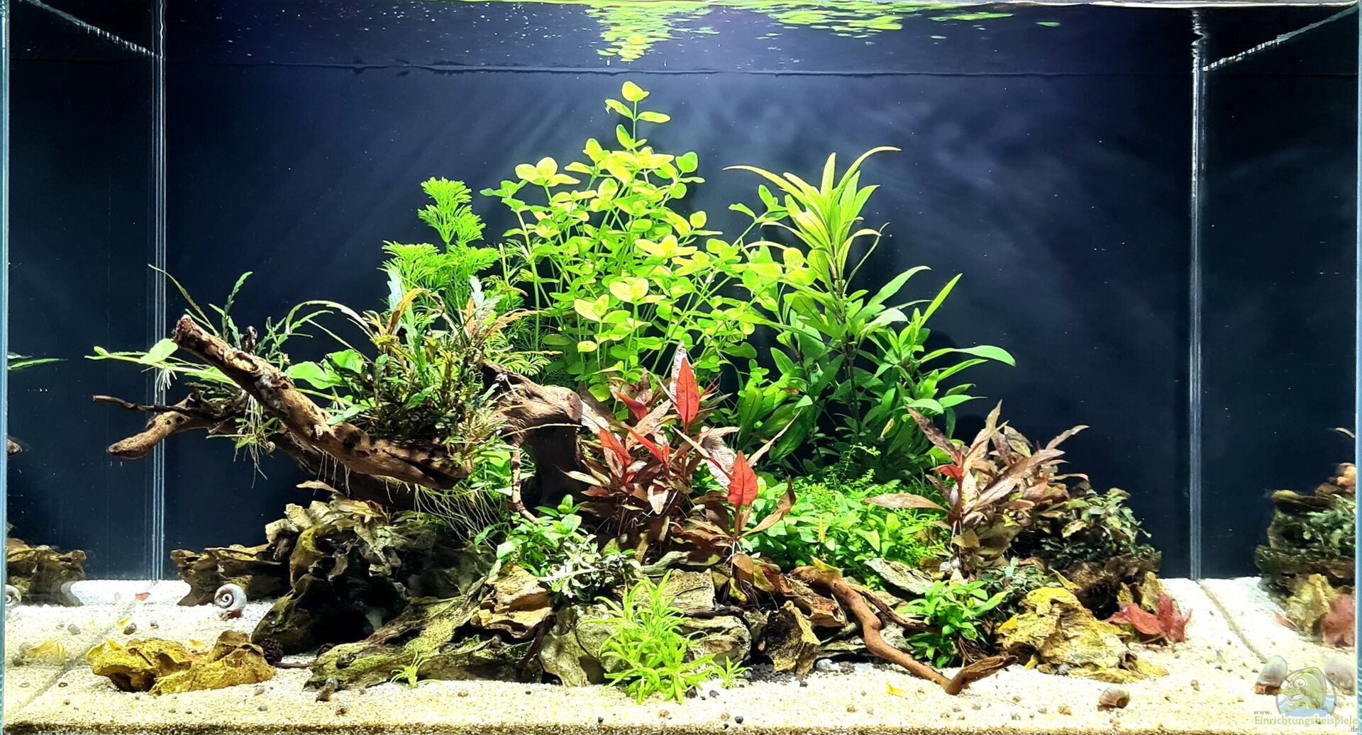 Weißglas-Aquarium Die Rückwand wurde außen mit schwarzen Lack behandelt. Dies schafft einen sehr hohen Kontrast zu dem weißen Sand im Vordergrund und lässt die Pflanzen etwas "knalliger" wirken. Auch die Farben der Fische und Garnelen kommen hierdurch etwas mehr zur Geltung.