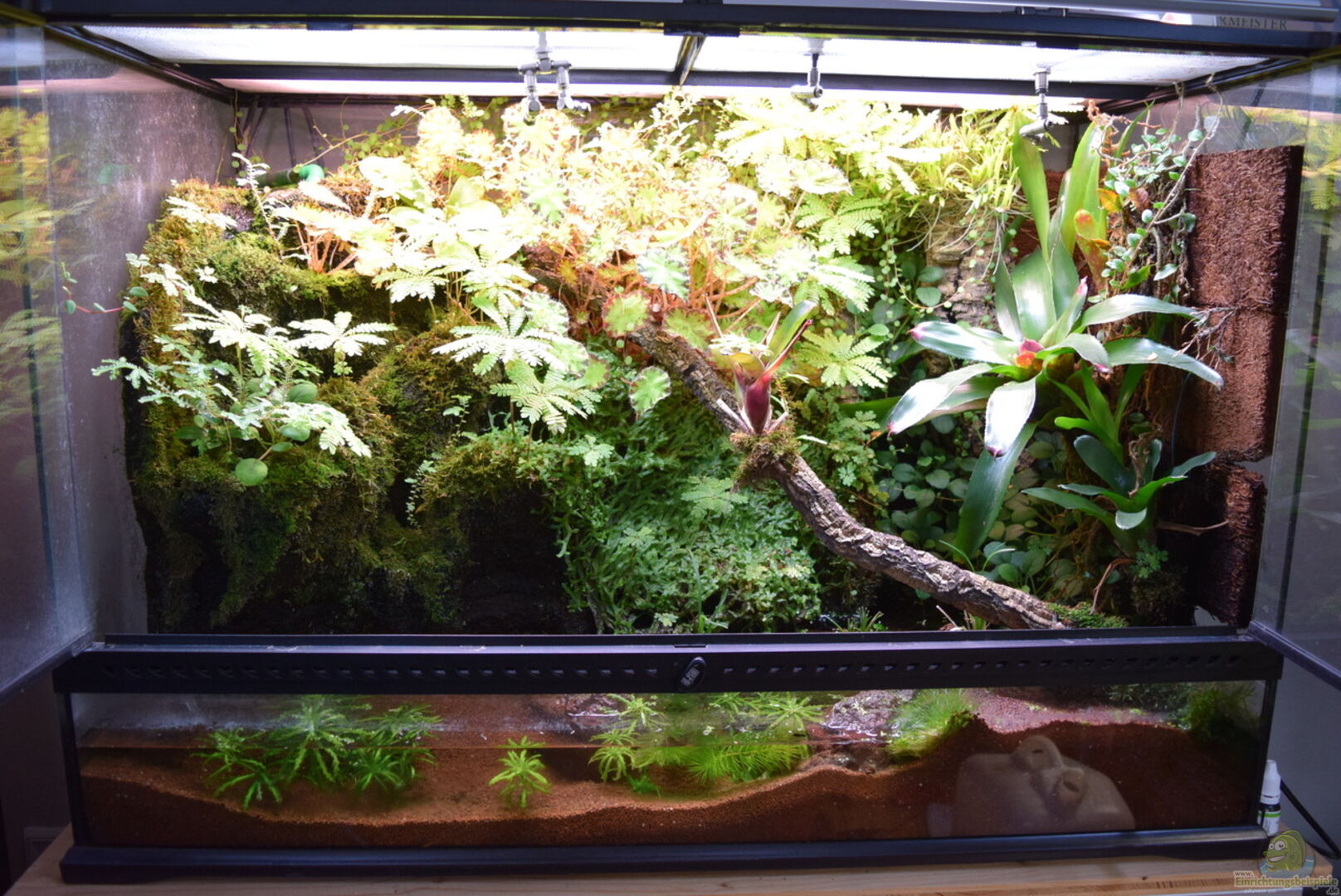 Bei diesem Tank handelt es sich nicht um ein klassisches Aquarium, sondern um ein Paludarium/Aquaterrarium/Riparium und ist von der Firma Exo-Terra. Der Aufbau besteht aus einem geschnitztem Styroporberg, der mit einem 2-Komponenten-Harz komplett /wasserdicht überzogen wurde. Im noch weichem Zustand ist dieser mit feinem Torf incl. Moossamen beflockt worden. Der Berg steht auf 3 Glaskreuzen, darunter befindet sich also Wasser, incl. Heizstab und Pumpe. Die Pumpe befördert das Wasser 50 [...]