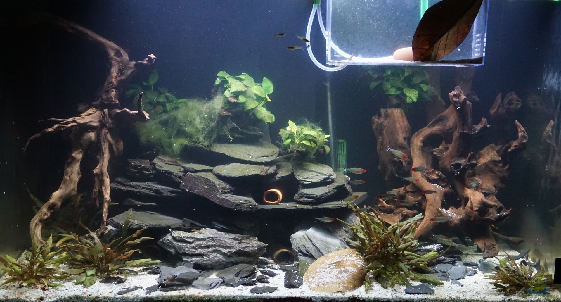 Normales Eheim Incpiria Becken mit Bohrung für einen Au??enfilter. Das Aquarium dient in erster Linie als Zuhause für Hypancistrus zebra (L46). Als die Tiere anfingen zu brüten, habe ich beschlossen das Aquarium auf ihre Bedürfnisse umzustellen.
