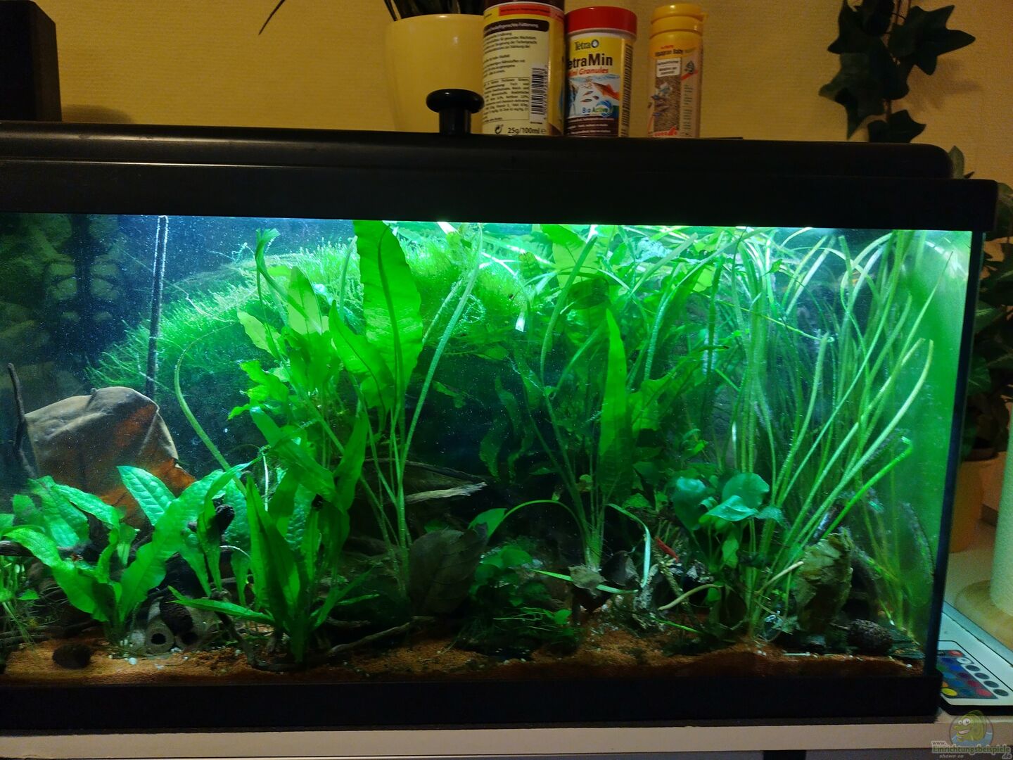Standardbecken, stand im Keller, gereinigt und neu aktiviert steht in meinem Büro/Männerzimmer im Keller auf einem Alu-Gestell eines 1 Meter Beckens, dieses habe ich verkauft auf Grund der gestiegenen Energiepreise und da ich keine Abnehmer für meine ständigen Sajicas hatte Für da Becken habe ich nur Deko, Pflanzen und Besatz gekauft, Hardware sind Restbestände aus dem Keller Rückwandfolie in Steinoptik