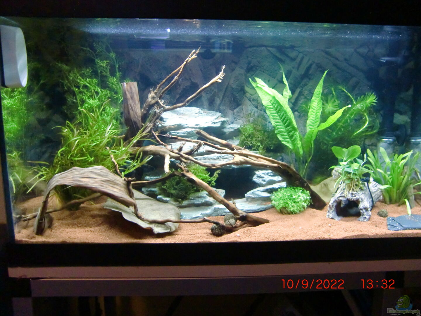 Standardbecken, stand im Keller, gereinigt und neu aktiviert steht in meinem Büro/Männerzimmer im Keller auf einem Alu-Gestell eines 1 Meter Beckens, dieses habe ich verkauft auf Grund der gestiegenen Energiepreise und da ich keine Abnehmer für meine ständigen Sajicas hatte Für da Becken habe ich nur Deko, Pflanzen und Besatz gekauft, Hardware sind Restbestände aus dem Keller Rückwandfolie in Steinoptik