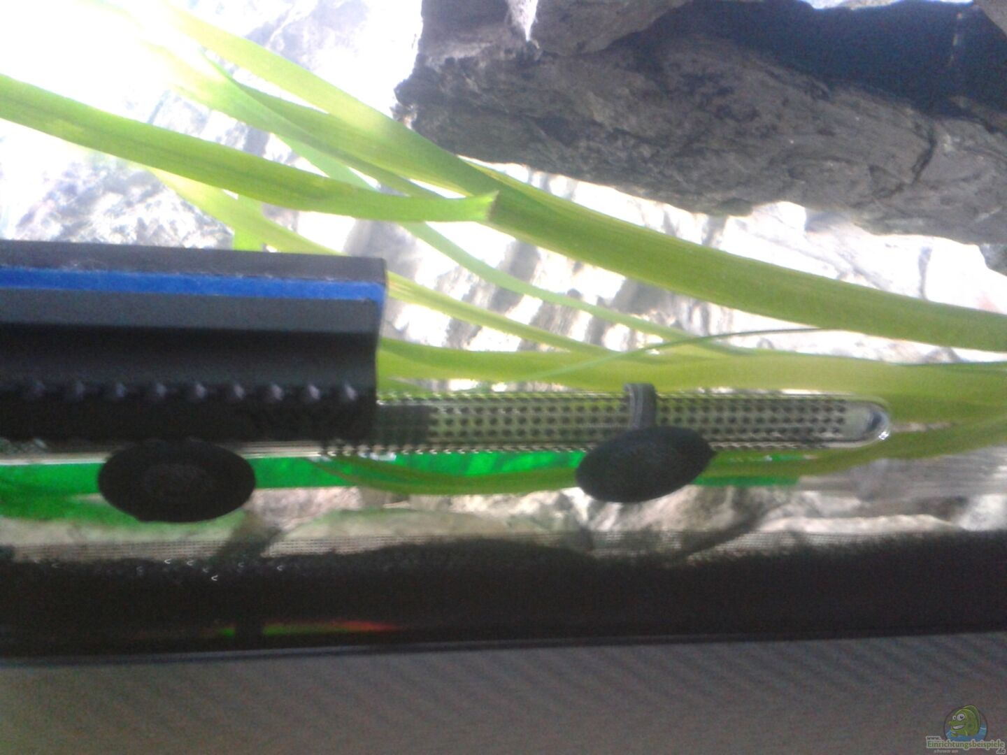 Strömungspumpe Wave Maker 2500l/Std. Luftheber damit das Wasser hinter der Rückwand stetig zurück ins Becken gepumpt wird. Heizstab von Juwel mit 200 Watt Schego Luftpumpe angeschlossen an den Luftheber LED Mondlicht 2x30 cm löst das Tageslicht ab