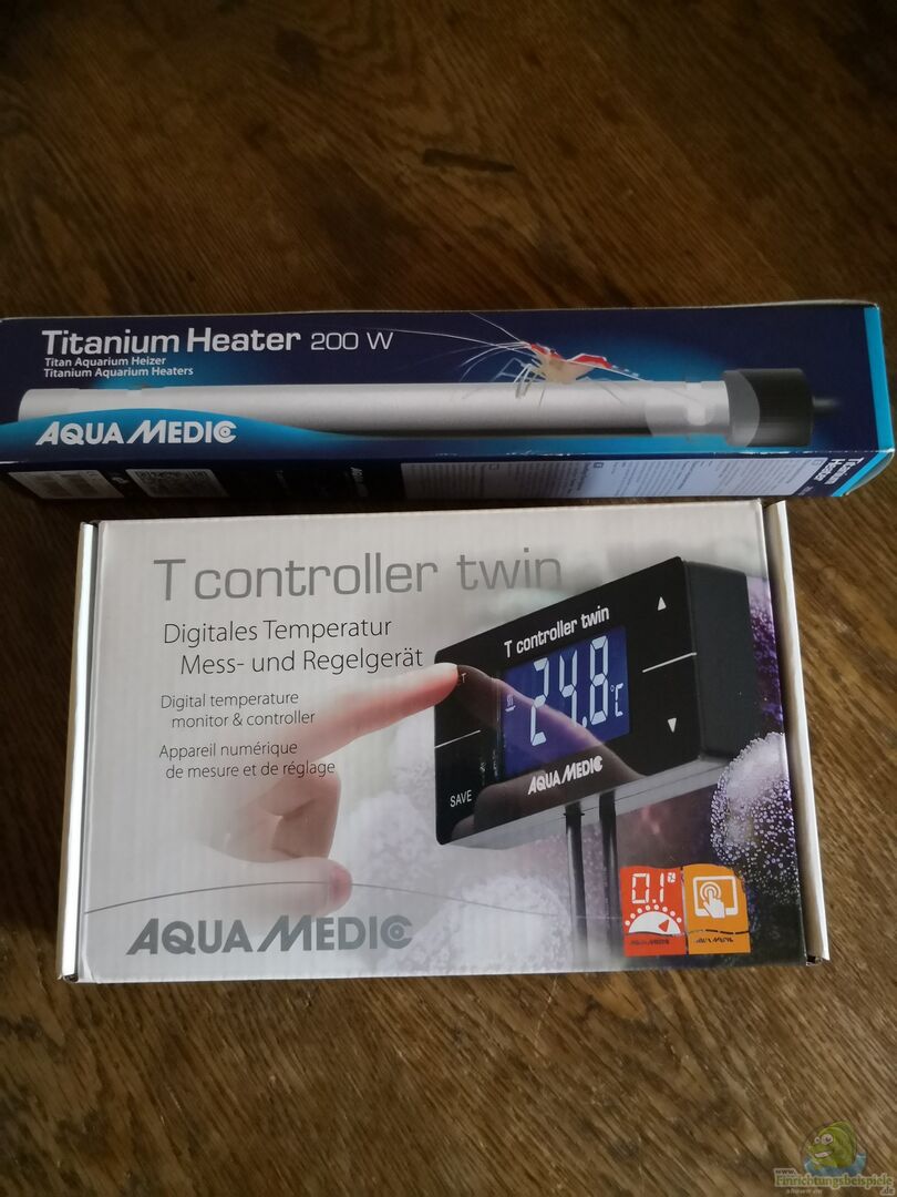 Heizstab Titan Heizstab mit 200 Watt Leistung und einem Aqua Medic T-Controller Twin Der Controller ist mit einem digitalem Display und einer Doppelsteckdose ausgestattet die zum heizen und kühlen, bei entsprechend angeschlossenen Geräten, verwendet werden kann.