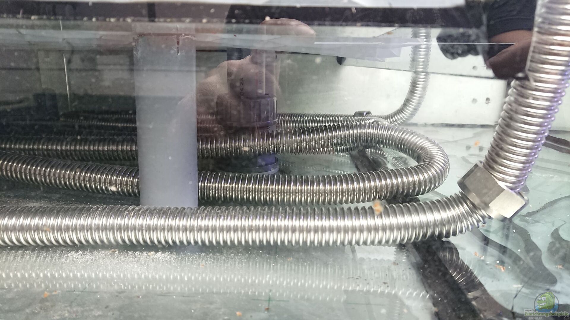 Heizung läuft über einen selbstgebauten Wärmetauscher an der Zentralheizung und externer Temperaturregelung per Magnetventil. Gegen den sehr starken bräunlichen Schleier wird Ozon per Sprudelstein eingepumpt. Eine zusätzliche Tunze-Strömungspumpe hinten links sorgt für ein wenig Strömung auf der linken Seite. Per Schwerkraftprinzip läuft Wasser aus der Klarwasserkammer des zweiten Filterbeckens in ein 5l-Rohr gefüllt mit Zeolith und von dort aus in ein 12er HT-Rohr mit ca. 220cm [...]