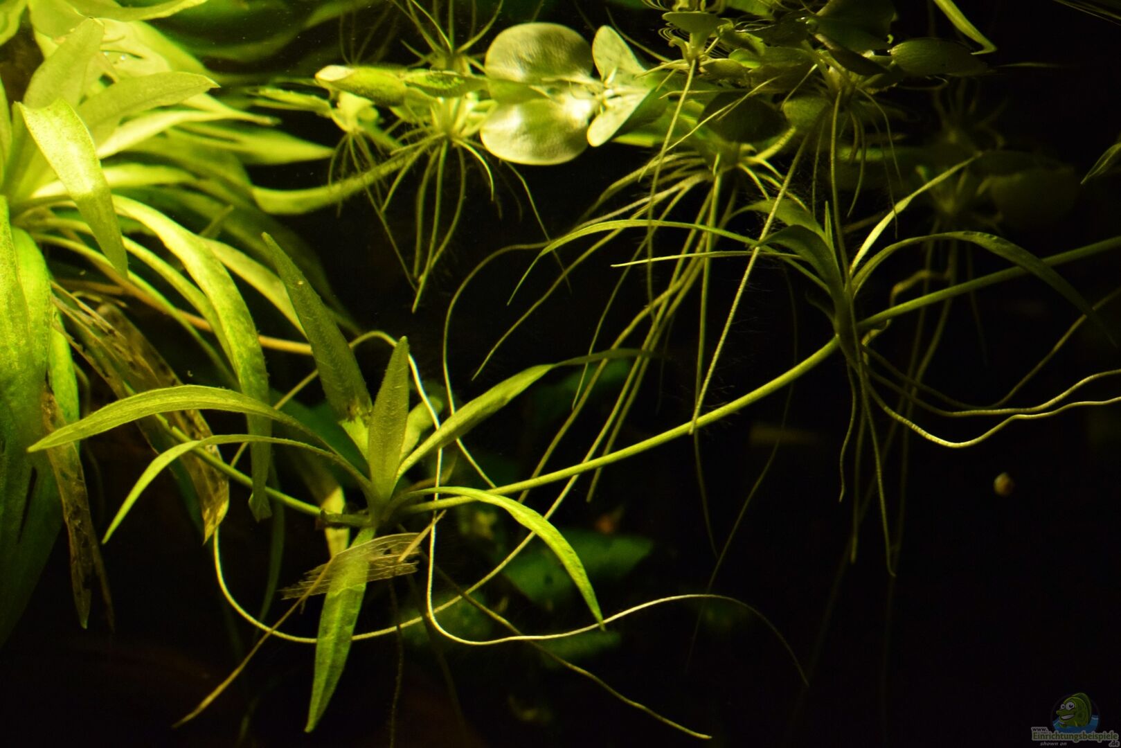 Folgende Pflanzen sind im Becken eingesetzt: Helanthium Quadricostatus 068 ES Typ: Zwergamazonaspflanze Herkunft: Südamerika Lichtbedarf: mittel pH-Wert: 5, 8 bis 7, 5 Wasserhärte: sehr weich bis hart Wassertertemperatur: 20 bis 28° C Limnobium laevigatum 063 TC Typ: Schwimmpflanze Herkunft: Südamerika Lichtbedarf: mittel bis hoch pH-Wert: 6, 0 bis 8, 0 Wasserhärte: sehr weich bis hart Wassertertemperatur: 10 bis 28° C Anubias nana Typ: Aufsitzerpflanze Herkunft: [...]