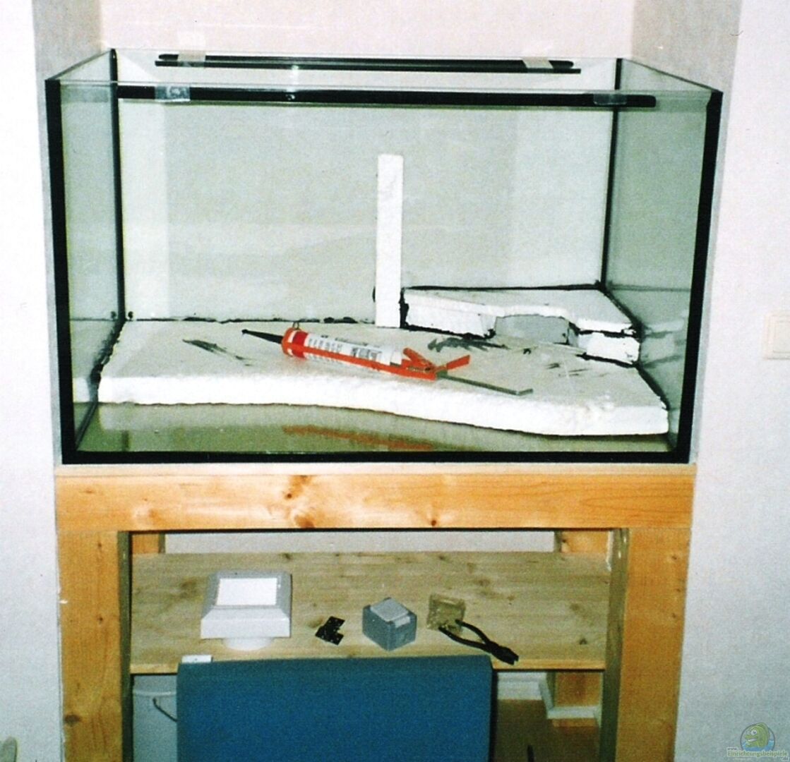 Granitsteine in verschiedenen Grö??en, teilweise sind diese bis an die Wasseroberfläche gestapelt. Sie stehen auf einer etwa 4cm dicken Styroporplatte, welche ich mit schwarzem Silikon versiegelt habe, in das ich, als es noch frisch war, Kies gedrückt habe. Das Gestein, welches ich von unseren heimischen Feldern gesammelt habe, hat keine scharfen Kanten, da es Geschiebematerial aus der letzten Eiszeit ist. Die Felswand steht frei im Becken. Auch hinter der Wand sind etwa 10cm freier Raum [...]