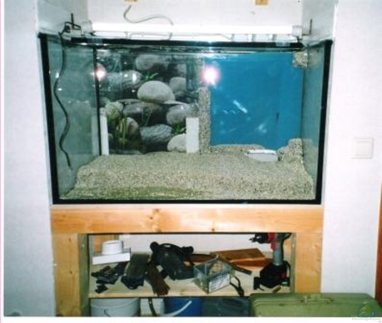 Das Becken steht in einer Nische im Esszimmer. Der Unterschrank und die Abdeckung sind Eigenbauten.