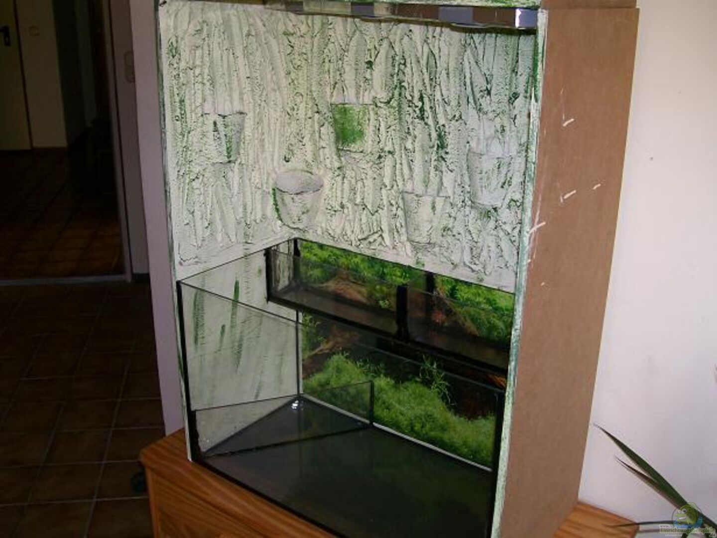 Dieses Aquarium ist eine Art Paludarium (Aquaterrarium), es bietet Fischen und Landpflanzen lebensraum. Es soll so natürlich wie nur möglich werden. In das AQ sind eine Terasse und ein Pflanzenkasten eingeklebt worden. ??ber das AQ wurde ein Holzkasten gestellt der mit Fliesenkleber ausgeklebt wurde und modelliert wurde. Dann wurden noch kleine Pflanzenkörbe auch mit Fliesenkleber eingeklebt.