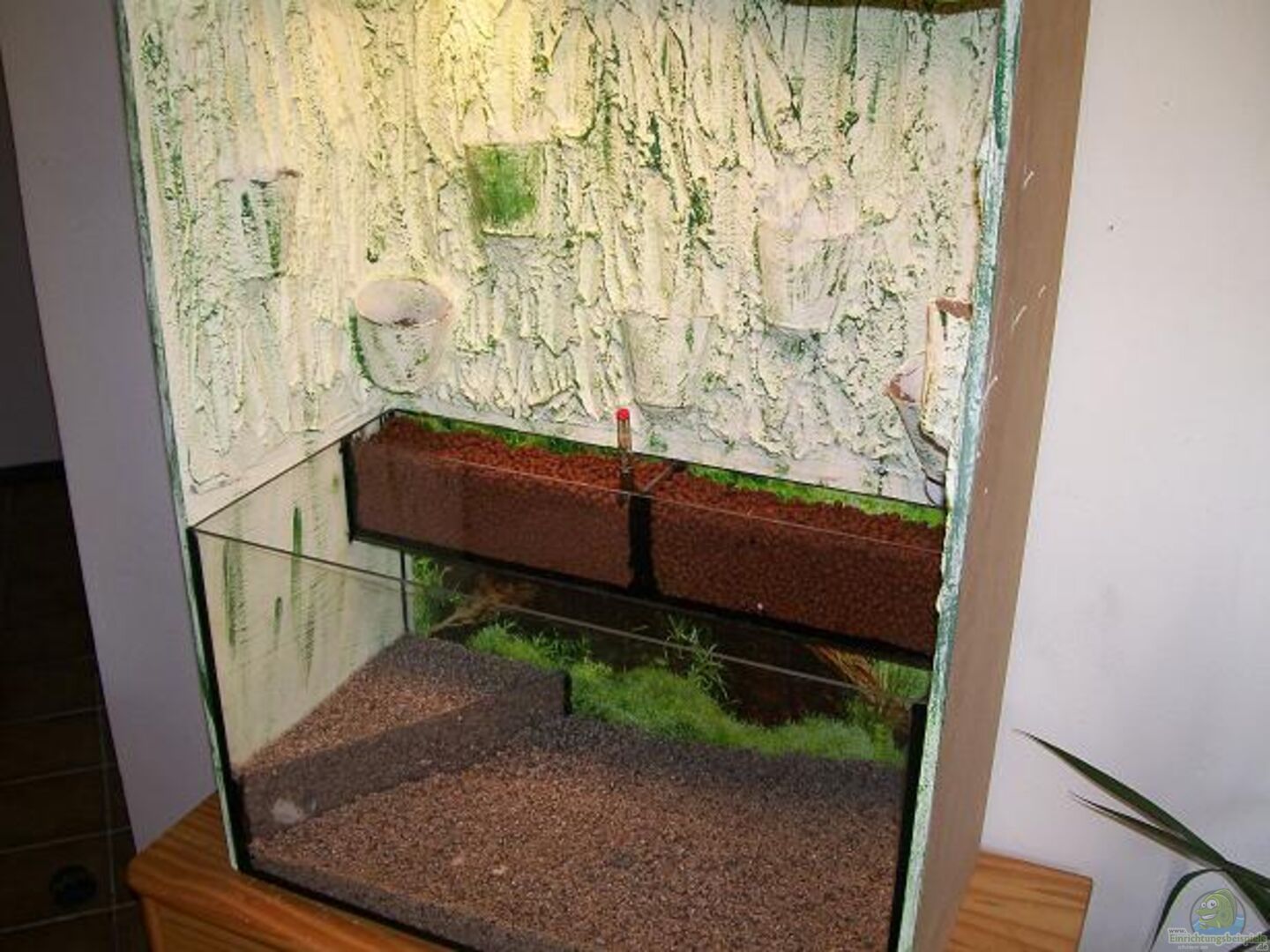 Dieses Aquarium ist eine Art Paludarium (Aquaterrarium), es bietet Fischen und Landpflanzen lebensraum. Es soll so natürlich wie nur möglich werden. In das AQ sind eine Terasse und ein Pflanzenkasten eingeklebt worden. ??ber das AQ wurde ein Holzkasten gestellt der mit Fliesenkleber ausgeklebt wurde und modelliert wurde. Dann wurden noch kleine Pflanzenkörbe auch mit Fliesenkleber eingeklebt.