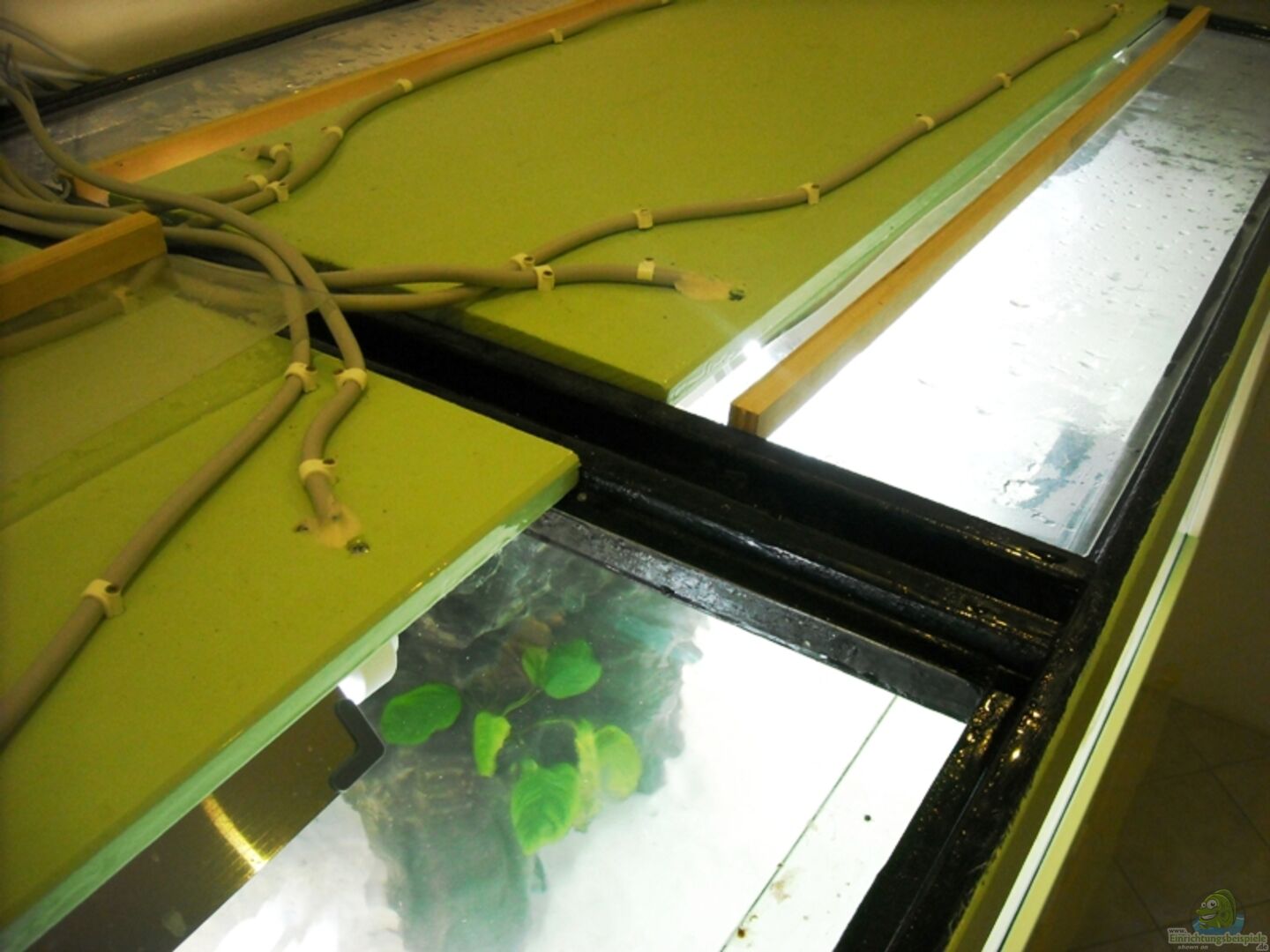 Das Aquarium wurde aus 12mm Floatglas gefertigt, auf Sto?? verklebt und mit einer Sicherheitsnaht versehen. Es verfügt über einen Mittelsteg, Längsstreben unten und oben und einer eingauten Filterkammer mit 4 Kammern. ***** Das Becken kommt von Megazoo. ***** Der Unterbau wurde aus 10x10cm Staffeln vom Baumarkt gefertigt und in eine Estrichausgleichsmasse gelegt um eine idelae Verbindung zu den vorhandenen Bodenfliesen zu ermöglichen. Weiters wurden die Staffeln mit 24 cm langen sechskant [...]