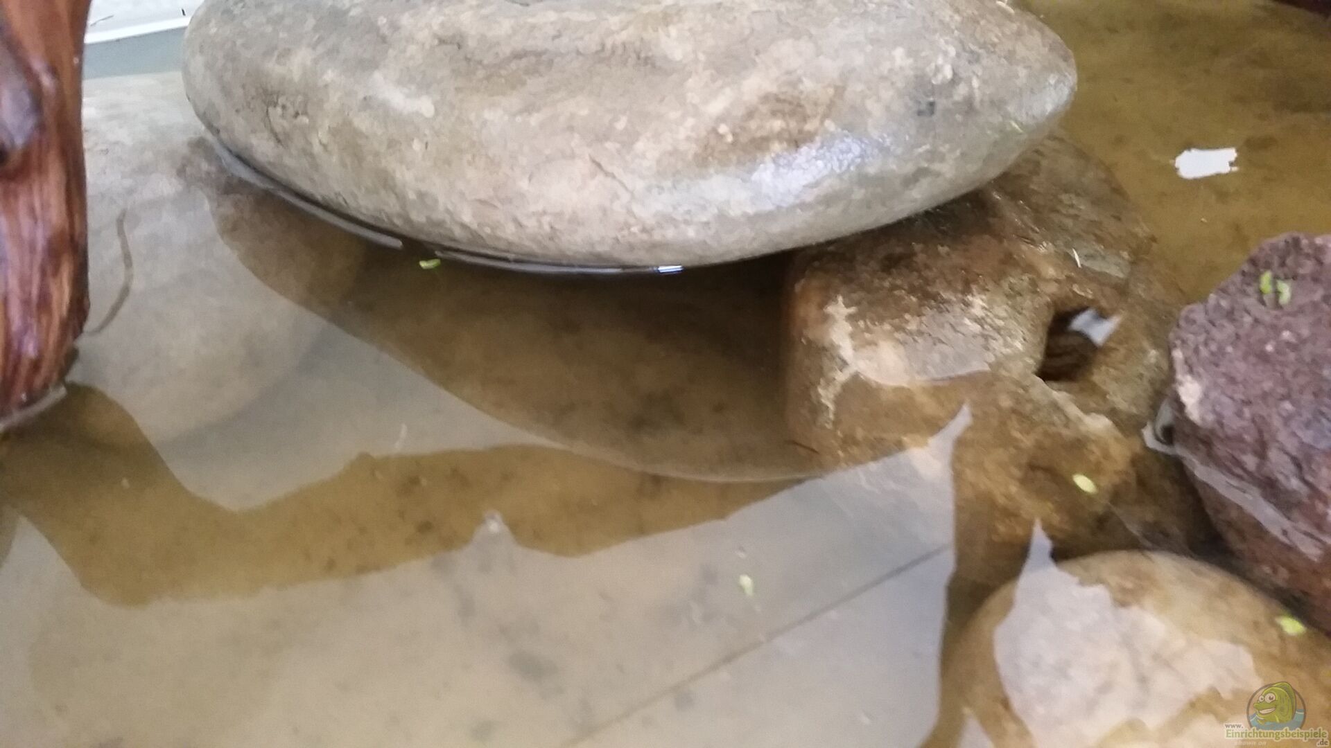 Die Rückwand besteht aus einer simplen Styroporplatte, welche ich schwarz besprayed und dann hinter dem Glas befestigt hatte. Ich musste zum Glück nichts leimen, da die Platte durch die Schläuche am Glas gehalten werden. Da die Platte hinter dem Glas sind verliere ich keinen Platz im Becken, muss mir keine Sorgen um eingeklemmte Tiere oder um Giftstoffe machen.
