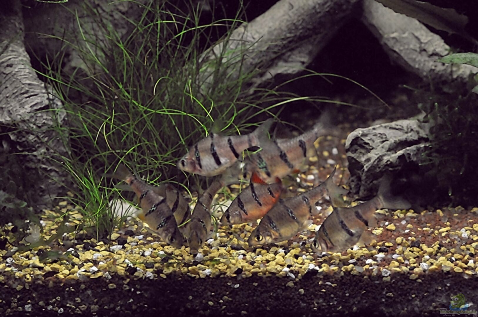 12 Fünfgürtelbarben (Barbus pentazona, 8 W, 4 M); 3 Knurrende Zwergguramis (Trichopsis pumilus, 3 W ?) 10 Amanogarnelen als Erstbesatz. Ob alle noch vorhanden sind, ist nicht zu kontrollieren. Vor kurzem wurden noch 7 Stck. gezählt. 3 ´Zebra-Rennschnecken´. Dank der dichten Bepflanzung und vielen Rückzugsmöglichkeiten vertragen sich Barben und Zwergguramis und beachten einander kaum.