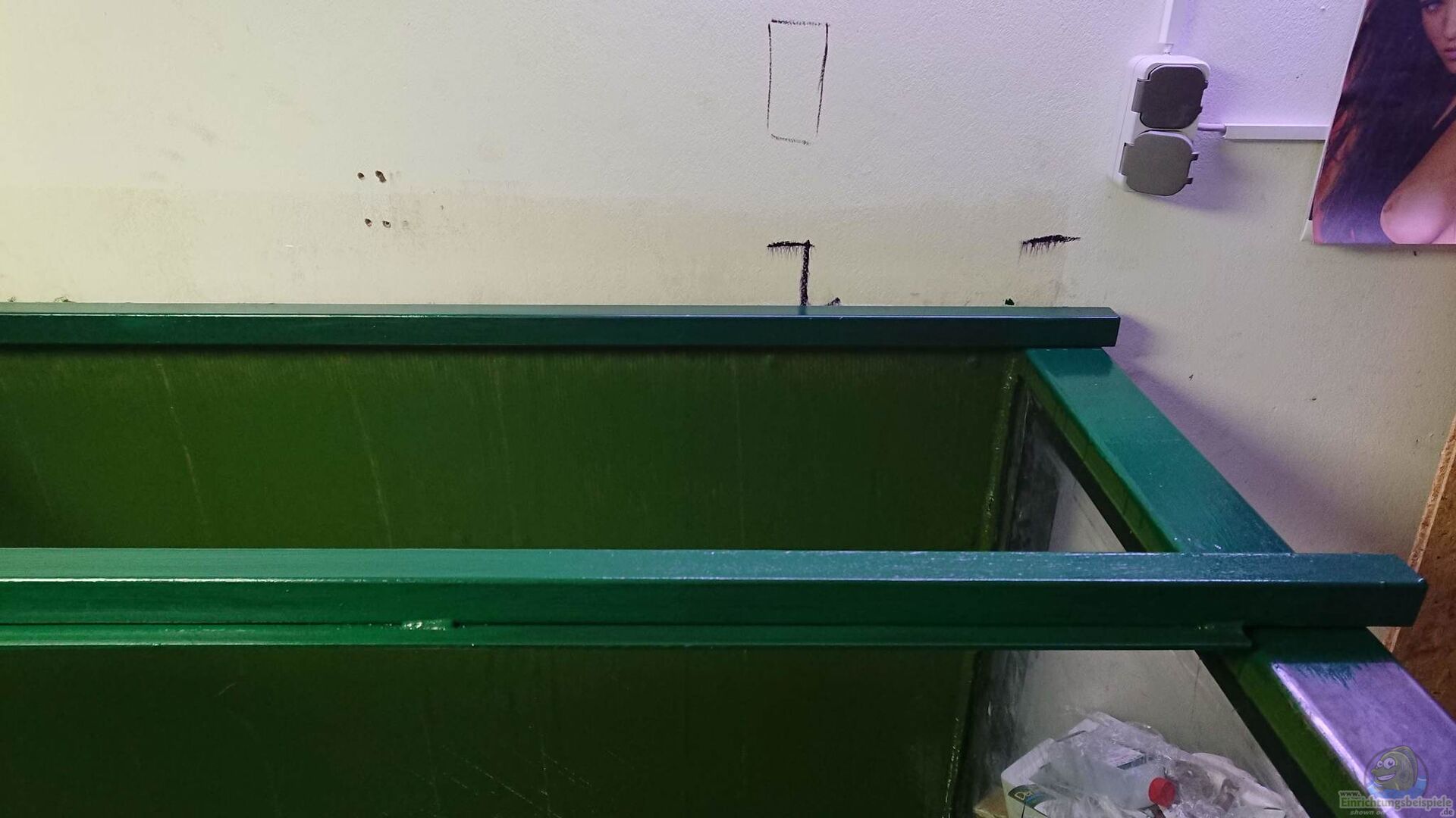 Das Becken besteht aus GFK und einer Frontscheibe. Ein Kellerraum ist durch die Frontscheibe abgetrennt worden und dahinter wurde dann mit Glasfasermatten und Epoxidharz das Becken gebaut. Die Filterung steht oberhalb des Beckens und besteht aus zwei 130cm Filterbecken.