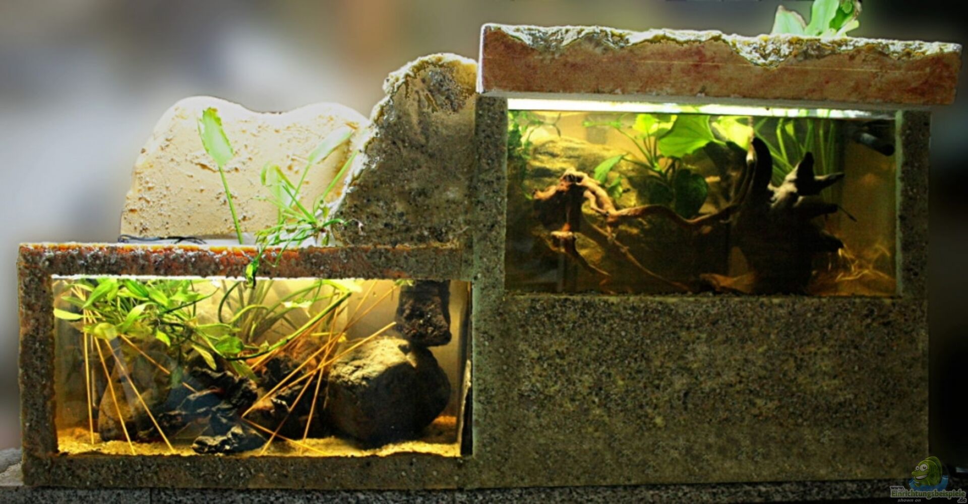 Zur Legende... zwei alte 60l-Becken sollten entsorgt werden, dienen jetzt für dieses Projekt. Dabei wird das Becken mit Flu??lauf(das Obere) um 25cm höher gestellt. Am Ende zum unteren Becken wird eine modellierte Kante geformt , die es ermöglicht, das gepumpte und auch gefilterte Wasser in breiter Form ins untere Becken fallen zu lassen. Desweiteren ein ´Gebirge´ bzw. Uferböschung an den Seiten des oberen Beckens instaliert wird , welches mit subalpinen Wasserpflanzen bestückt [...]