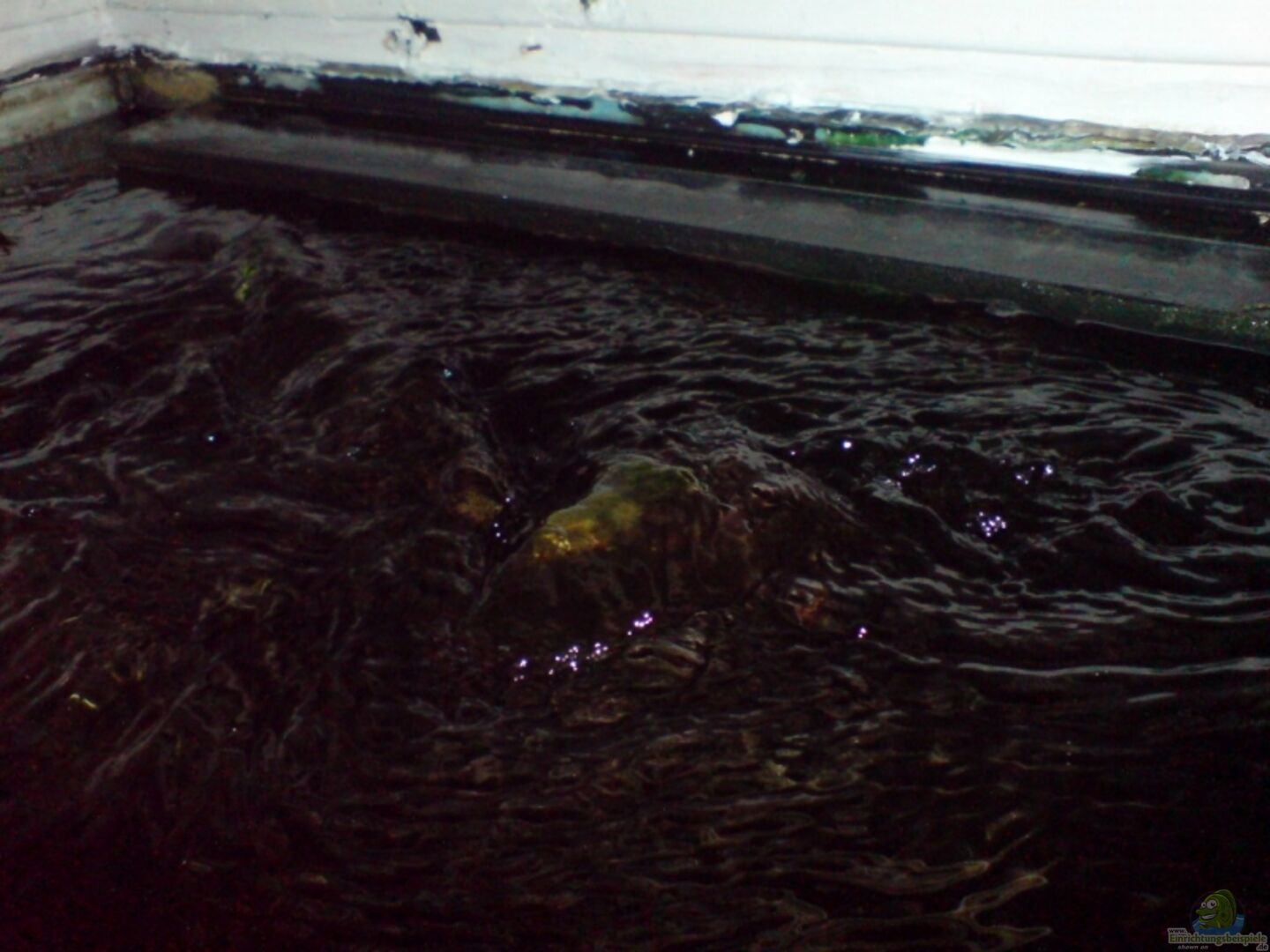 Granitsteine in verschiedenen Grö??en, teilweise sind diese bis an die Wasseroberfläche gestapelt. Sie stehen auf einer etwa 4cm dicken Styroporplatte, welche ich mit schwarzem Silikon versiegelt habe, in das ich, als es noch frisch war, Kies gedrückt habe. Das Gestein, welches ich von unseren heimischen Feldern gesammelt habe, hat keine scharfen Kanten, da es Geschiebematerial aus der letzten Eiszeit ist. Die Felswand steht frei im Becken. Auch hinter der Wand sind etwa 10cm freier Raum [...]