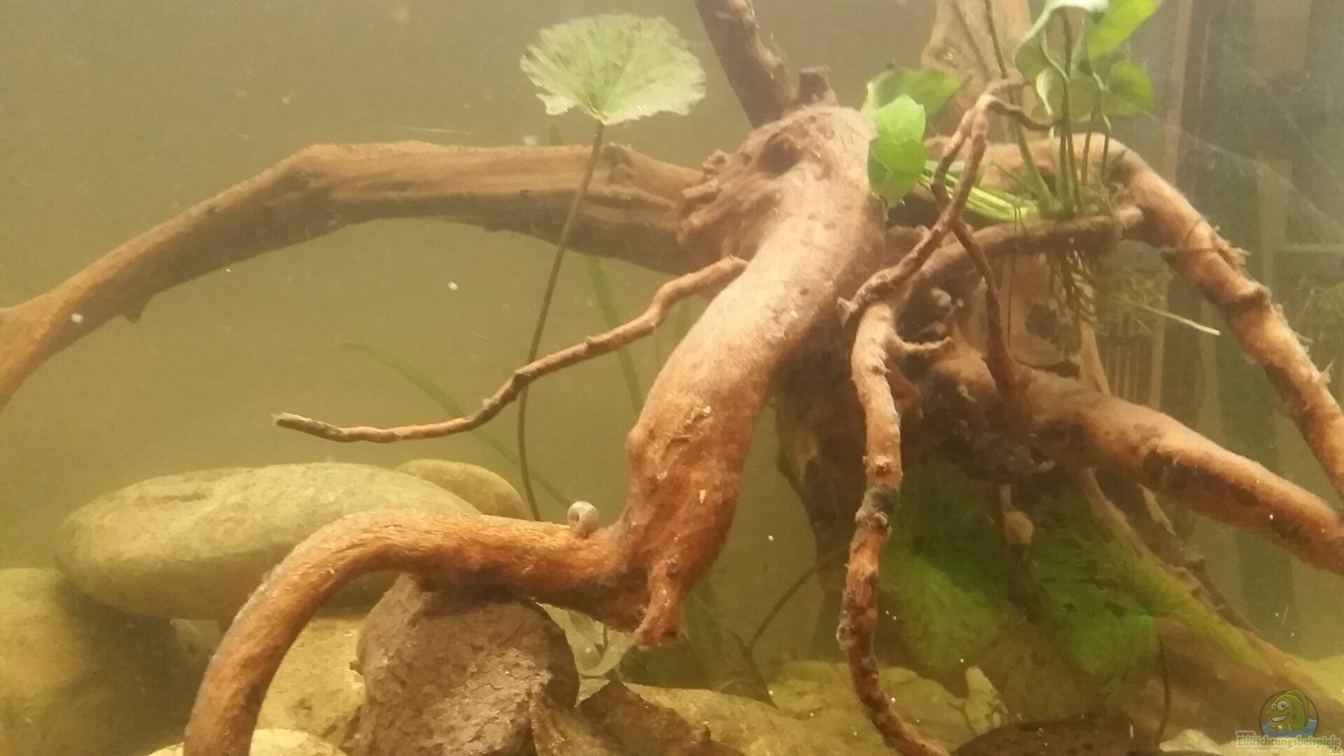 Die Rückwand besteht aus einer simplen Styroporplatte, welche ich schwarz besprayed und dann hinter dem Glas befestigt hatte. Ich musste zum Glück nichts leimen, da die Platte durch die Schläuche am Glas gehalten werden. Da die Platte hinter dem Glas sind verliere ich keinen Platz im Becken, muss mir keine Sorgen um eingeklemmte Tiere oder um Giftstoffe machen.