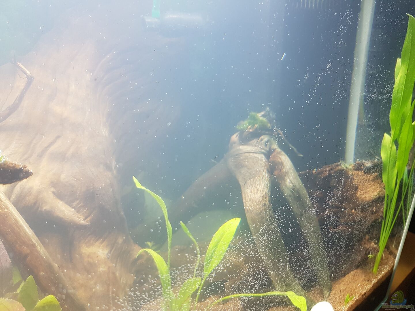 Eine Dicke Wurzel an der Rückwand hingestellt so das sie vom Boden bis zur Wasseroberfläche reicht. Es ist eine Mangrovenwurzel und die haben wir über A....n bezogen und wahren sehr überrascht von der Schönheit dieser Wurzel. 3 x15-20 cm Moorkienwurzel Moorkienholz mit 2 Garnelenbäumchen Wurzel. Auch bestellt und es sind auch schöne Wurzeln. 2 Kokosnuss schalen als Unterschlupf. Ein Paar kiesel.