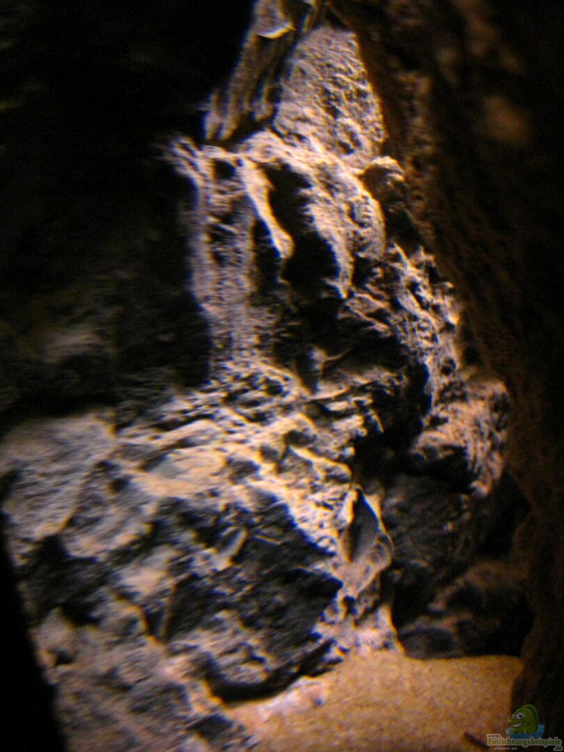 Sandsteinfelsen ca. 210 kg, die Grö??ten wiegen ca. 50 kg, war eine heikle Angelegenheit die ins Becken zu bekommen. Unter den gro??en Felsen liegt zum Schutz der 16 mm Bodenplatte, nochmals eine 2 cm starke Styroporplatte. Die Felsen können so nicht von den Fischen untergraben werden. Die Rückwand hat eine Tiefe zwischen 2 und 14 cm. Sie kann auf fast der gesamten Länge durchschwommen werden und bietet so Weibchen und unterlegenen Fischen zusätzlichen Schutz.