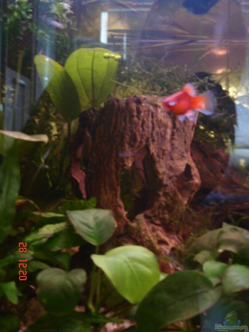 Hinter der Baumstamm-Statue die Amazonen Schwertpflanze und vorne roter Corallenplatty von Vanessa Matuszek (4)