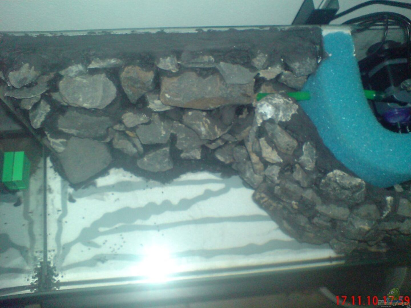 Steinaufbauten mit vielen Versteckmöglichkeiten, Erlenzapfen, Eichenlaub, Seemandelbaumblatt, Moorholz, Moorwurzel.
