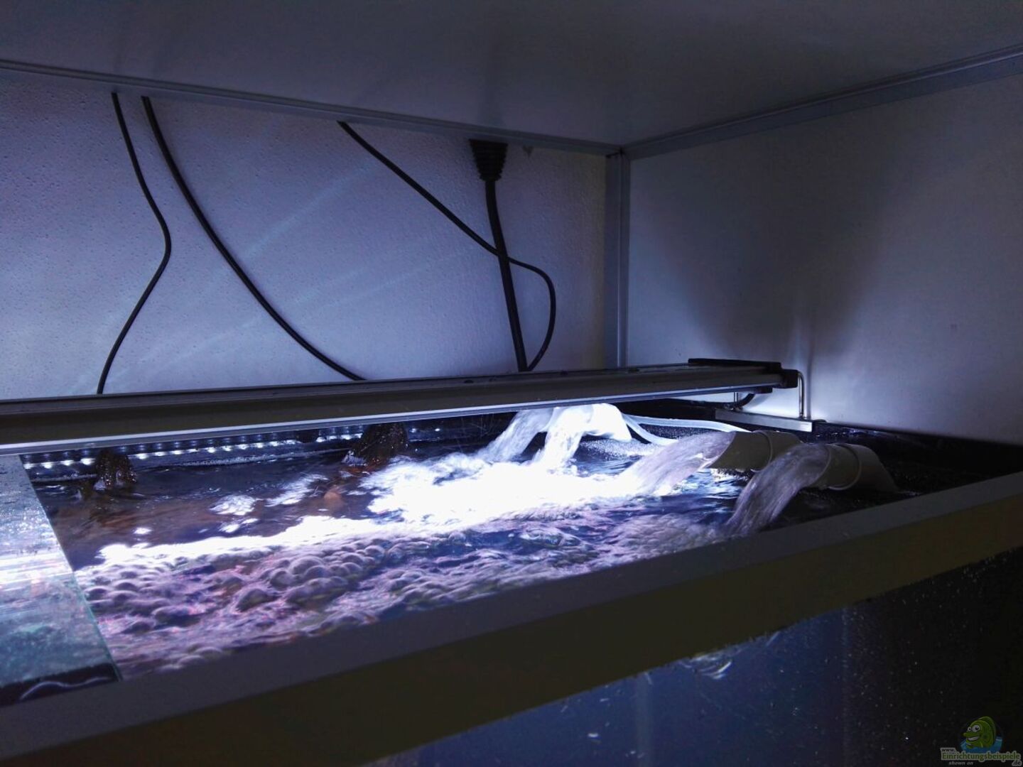3 Scheiben des Aquariums sind mit schwarzer Farbe gestrichen. Das Becken steht in einem Regal mit insgesamt 4 Aquarien mit je 300 Litern Volumen. Das Aquarium wurde von der Firma Aquarienkontor gebaut.