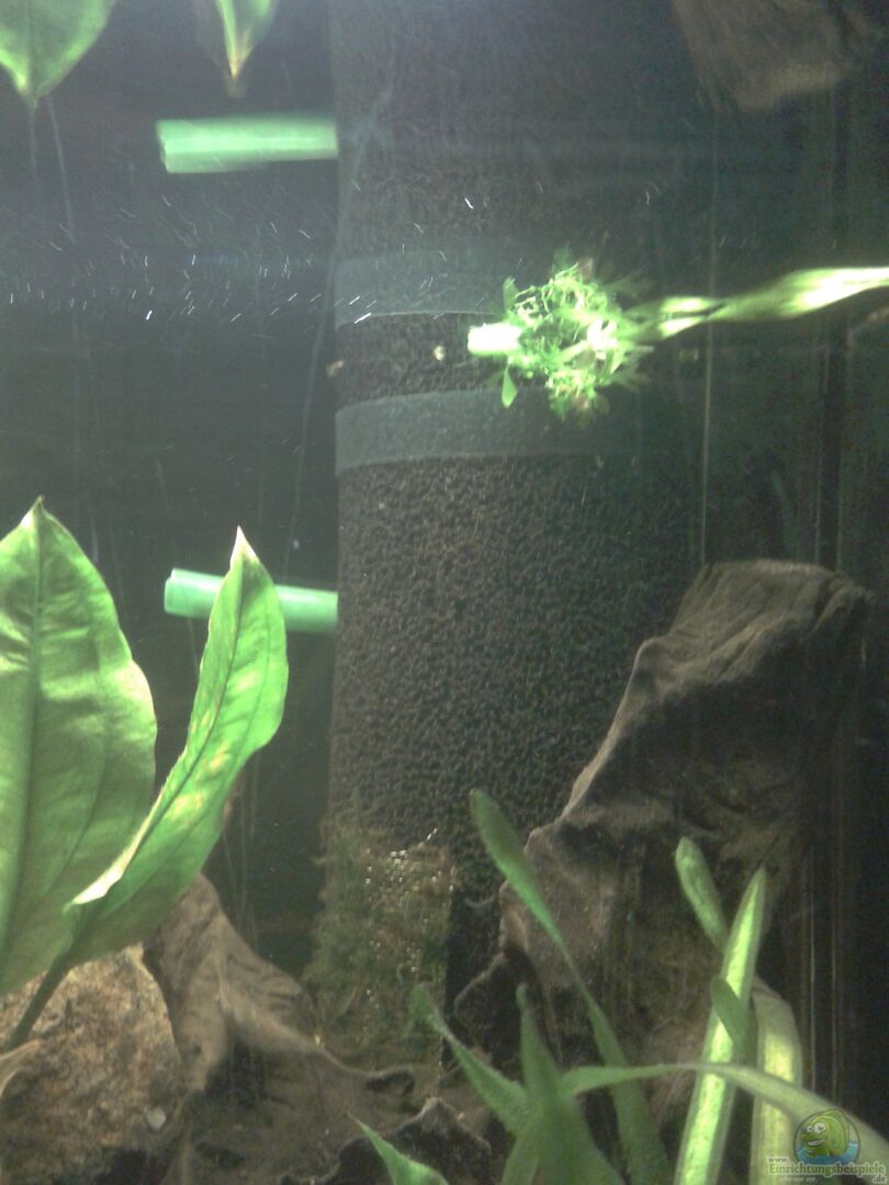 Für die wasseroberflächen Bewegung hab ich eine Strömungspumpe Eheim compact300 150-300l/h an der linken Seite angebracht. Da Skalare eher langsam flie??ende Gewässer mögen habe ich die Pumpe auf 150l/h eingestellt. 1 x Eheim Jäger Heizstab 150 Watt, der mit der Beleuchtung zusammen Ein und Aus geschaltet wird (9:00-21:00). Der Heizstab ist hinter der Filtermatte des HMF angebracht. Temperatur Tagsüber: 26-27 °C Temperatur Nachts: 21-22 °C Im Sommer ist der Heizstab ganz ausgeschaltet. Bio [...]