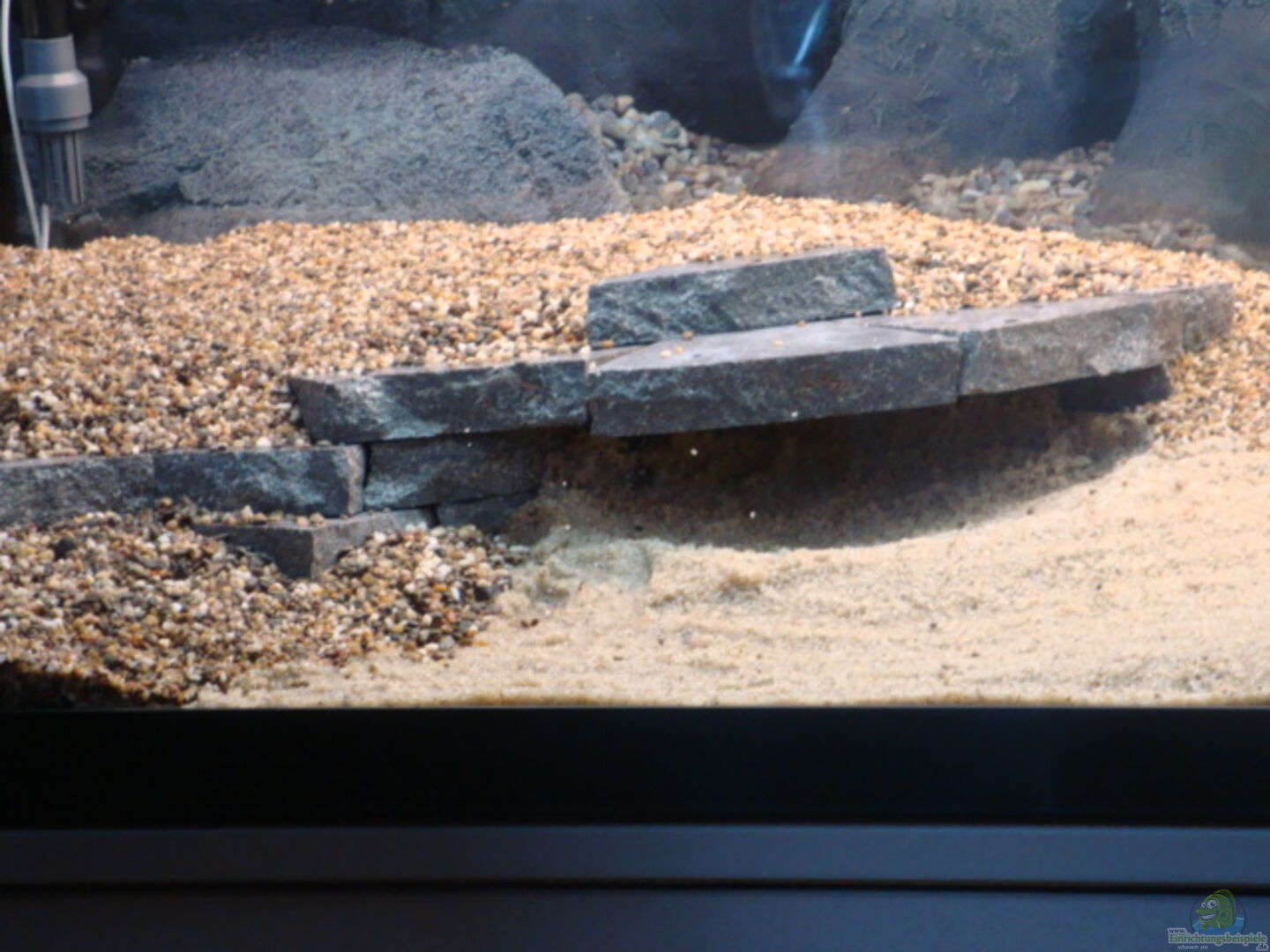 Eine Natursteinplatte (belgischer Blaustein) in Stücke gebrochen und zu Terrassen und Höhlen aufgebaut, verklebt mit Juwel Conexo. 2 Höhlen aus Kokosnussschalen 3 Mangrovenwurzeln (aus meinem alten Aquarium) 2 rote Moorwurzeln/Rebholz getrocknete Buchenzweiglein