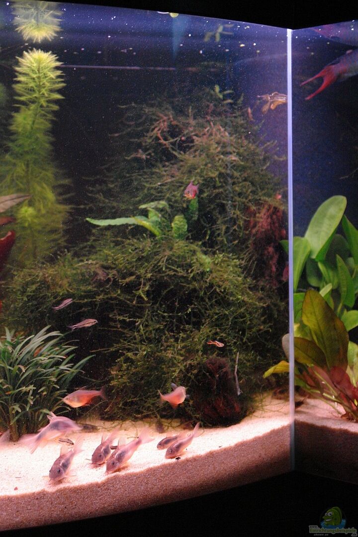 2 gro??e Jati Wurzeln. Die Linke ist flach und bildet unten 2 Höhlen. Sie ist mittlerweile ganz mit Javamoos zugewachsen. Die Rechte reicht bis zur Wasseroberfläche und verdeckt den HMF.