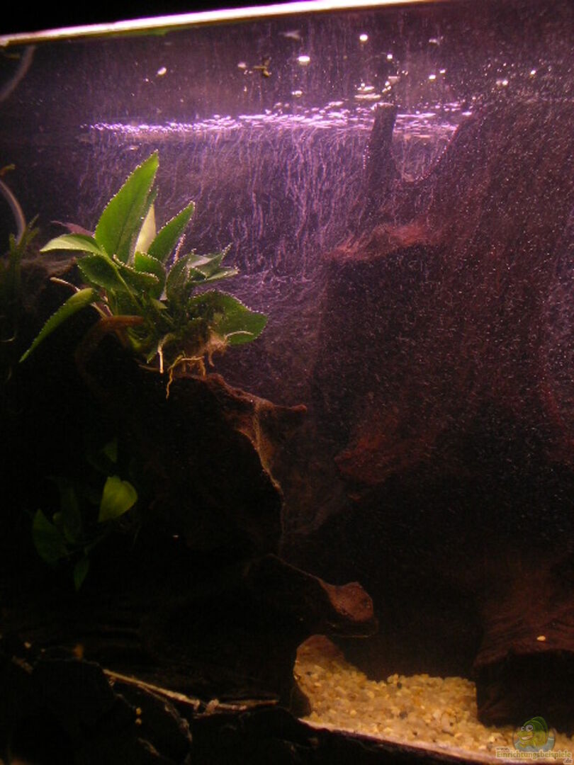 Terasse aus Plexiglas und Schiefer selber gebaut ind der sich eine Höhle befindet, eine Mangrovenwurzel mit in die Rückwand eingearbeitet desweiterem 4 Morkienhölzer davon 3 zusammen zueinem aufbuu zusammen geschraubt eine senkrecht aufgestellt. In der Rückwand befindet sich zusätzlich noch eine Höhle.